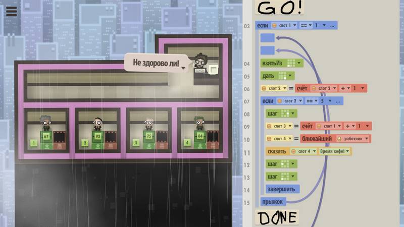 На каждом уровне вам предстоит решать интересные головоломки, связанные с написанием программ. Представьте, что вы в компьютерной машине, где каждый элемент — это человек, выполняющий свою роль. Этот распараллеленный компьютер предназначен для создания программного кода и достижения полной автоматизации рабочего процесса в вашем игровом офисе. Ваша цель — завершить автоматизацию всех процессов, чтобы одержать победу.