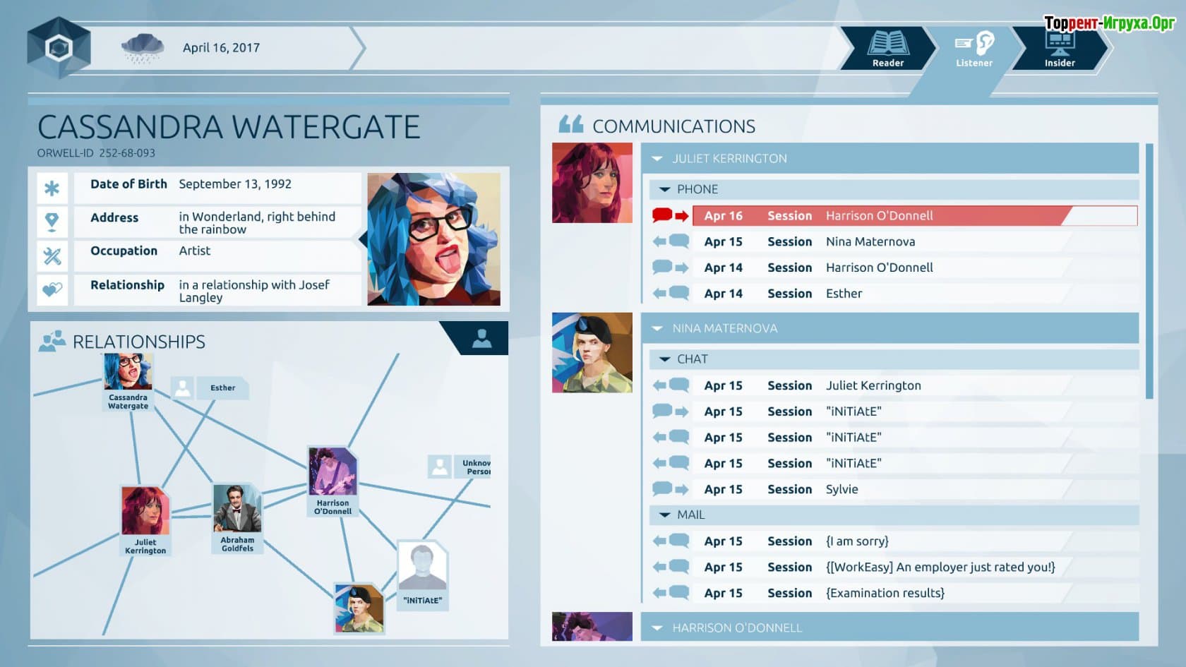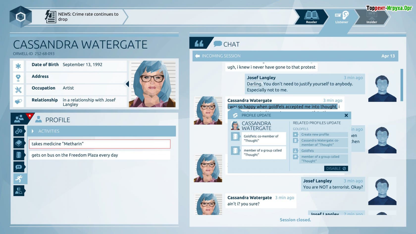 Orwell — это уникальная эпизодическая игра от Osmotic Studios, выпущенная в 2016 году, которая предлагает игрокам примерить роль системы наблюдения, подобной «Большому брату». Вместо классических детективных сюжетов или криминальных историй, вы становитесь виртуальным аналитиком, собирающим и анализирующим информацию о гражданах. Игра приглашает погрузиться в атмосферу цифрового контроля и расследований, где важно внимательно отслеживать детали и делать правильные выводы.