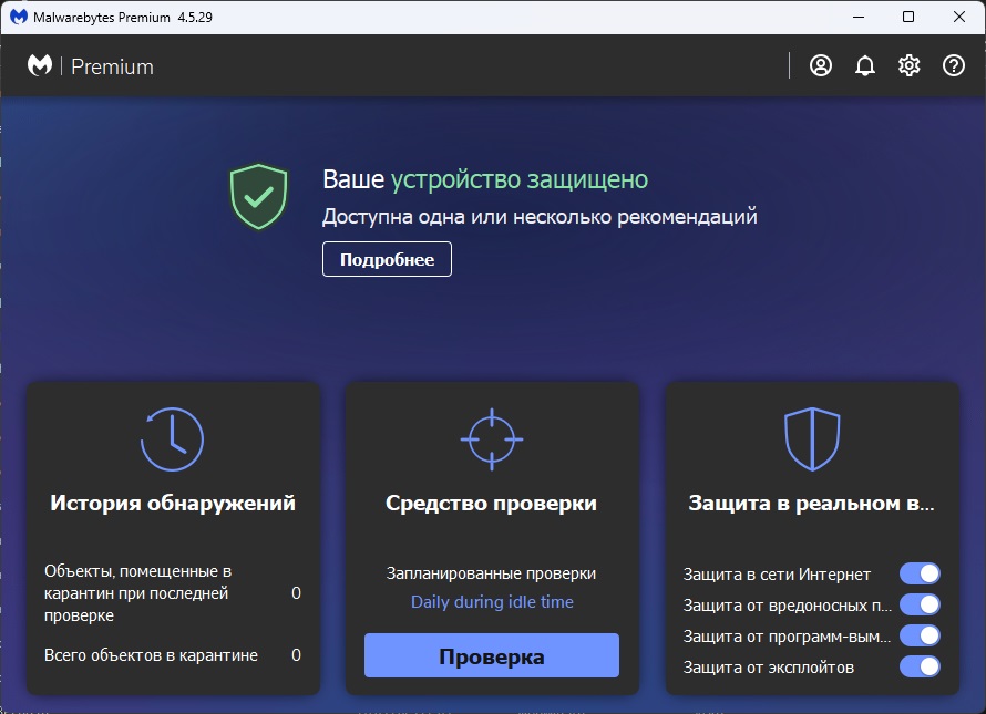 Malwarebytes Premium – это современное защитное решение, разработанное компанией Malwarebytes в 2026 году, которое отличается необычным подходом к антивирусной безопасности. Чтобы обезопасить себя от всех видов угроз в интернете, многие рекомендуют использовать эту программу вместе с традиционным антивирусом. Однако многие пользователи отказываются от других решений, оставляя только Malwarebytes Premium, так как она обеспечивает эффективную защиту в реальном времени от вирусов, фишинга, шифрования и эксплойтов. Программа активно предупреждает атаки нулевого дня с помощью проактивных технологий и объединяет возможности антивируса и инструментов восстановления в одном продукте.