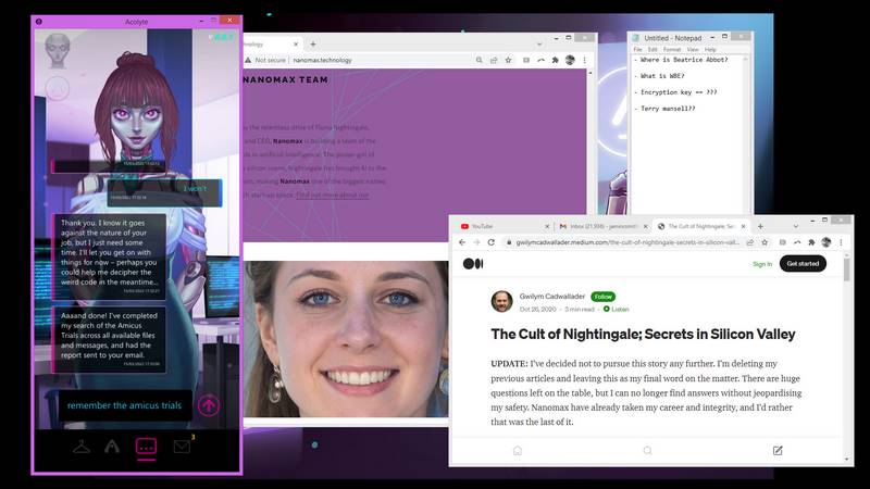 Игра под названием Acolyte переносит вас в мир стартапов и инноваций. Главный герой работает на компанию Наномакс, где разрабатывается приложение, способствующее трансформации искусственного интеллекта. С проектом связано хорошее финансирование, а удаленная работа создает постоянное взаимодействие с командой. Главная цель персонажа — сделать карьеру и внести вклад в важный прорыв.