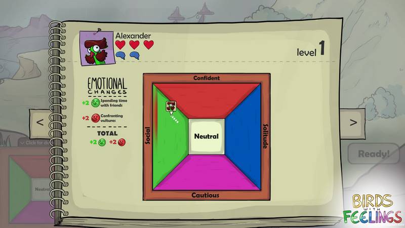 Игровой процесс в "Birds with Feelings" представляет собой уникальное взаимодействие персонажей, основанное на их эмоциональных состояниях. Игроки должны обращать внимание на птиц, которые испытывают схожие чувства с вашими героями, так как именно это влияет на ход игры. Управляйте своими пернатыми, руководствуясь личными целями, удовлетворяйте их потребности и стремитесь к самосовершенствованию!