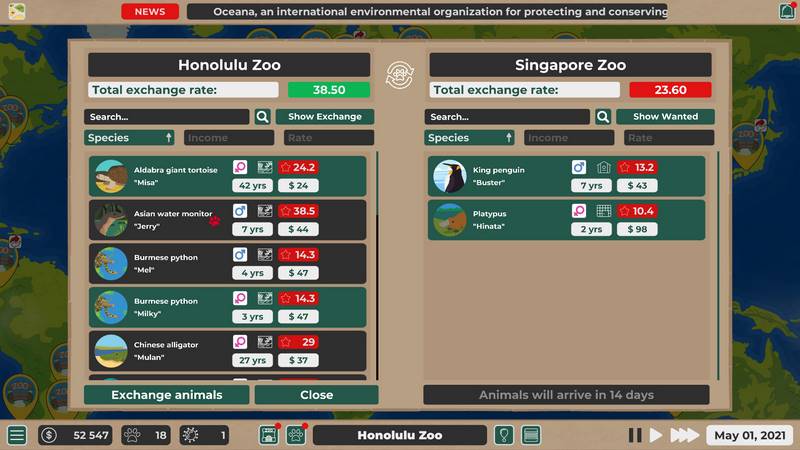 Вам предстоит взять на себя роль менеджера зоопарка, управляющего процессами обмена животных. Ваш зоопарк требует обновления, и существуют другие заведения, желающие обменять своих питомцев. Ваша задача — построить крепкие связи с этими зоопарками, чтобы получить желаемых представителей животного мира. Как вы уже поняли, основной валютой здесь являются животные. Вам необходимо максимально улучшить отношения для того, чтобы проводить больше обменов и получать от них выгоду.