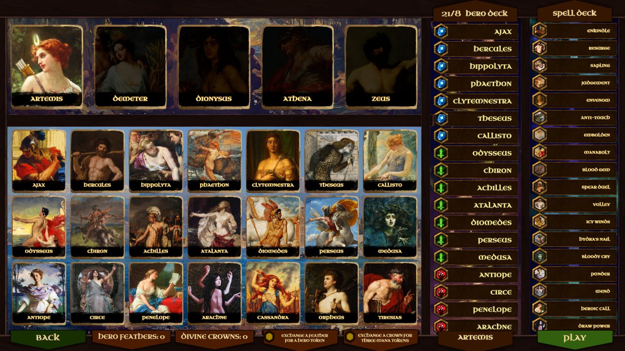 Cards of Divinity представляет собой карточную игру, в которой игроки сражаются за власть на Олимпе. Каждый ход может оказаться решающим, а ваши карты – настоящим ключом к успеху или неудаче. В этой игре вам предстоит взять на себя роль греческого божества, управлять героями, вызывать мощные заклинания и разрабатывать стратегии для одержания победы над врагами, чтобы занять свое место среди бессмертных. Имейте в виду, что неправильный выбор карты может стоить вам титула, поэтому стоит тщательно обдумать свои действия на поле боя.