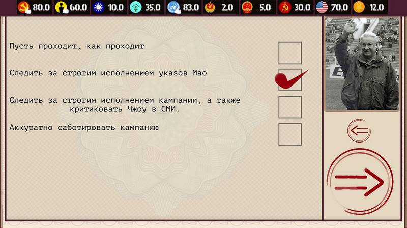 Ваши решения определяют, каким путем пойдёт Китай в China: Mao’s legacy. Можно постараться восстановить отношения с советскими руководителями или же стремиться к установлению связей с Западом и США — оба направления имеют свои плюсы и минусы. Также вы столкнетесь с тайной борьбой внутри партии, где вам будут противостоять опытные интриганы, стремящиеся подорвать ваше влияние и свергнуть вас с поста вождя. Приближайте к себе верных сторонников и не стесняйтесь устранять тех, кто может стать вашей угрозой, ведь они могут нанести удар в спину в самый неожиданный момент.