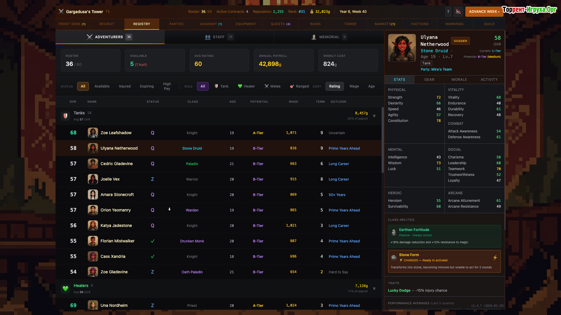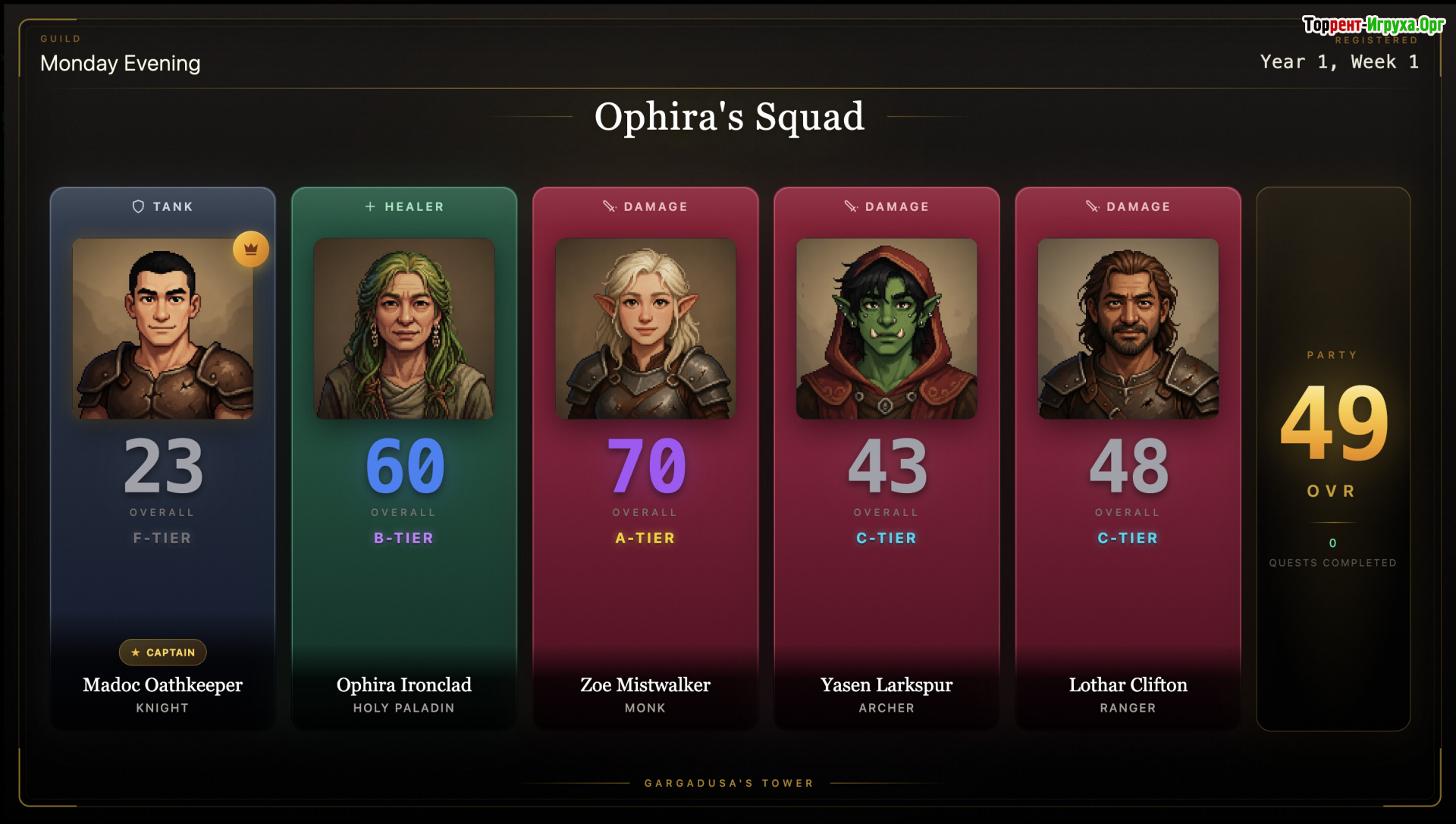 Gargadusa's Tower — это уникальный стратегический симулятор управления гильдией от разработчика The Math Team, выпущенный в 2026 году. В этой игре вы формируете команду искателей приключений и отправляете их в опасную стобашенную бездну, где смерть героев необратима. Каждый персонаж создаётся процедурно, учитывая знак зодиака, характер, амбиции и слабости, что влияет на его поведение как в бою, так и вне его.
