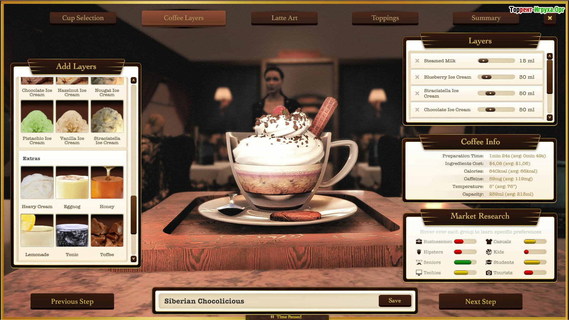 В этой игре вы возьмете под полный контроль кафе, ориентированное на элитных клиентов, и будете управлять каждым аспектом работы. Экономия пространства, продуманный и оригинальный дизайн интерьера, а также создание уникальных рецептов кофе — все это ключевые элементы, способные привлечь внимание взыскательной аудитории. Особая мини-игра позволит проявить творческий подход и разработать неповторимый напиток, что добавит глубины процессу управления.
