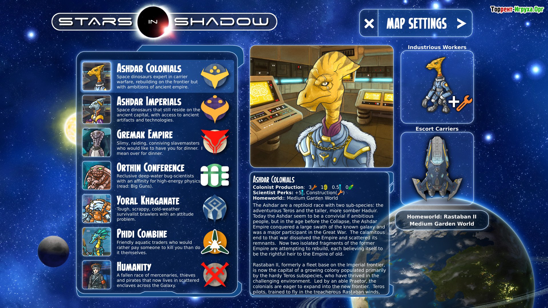 Stars in Shadow от разработчика Ashdar Games, выпущенная в 2017 году, представляет собой захватывающую глобальную стратегию, погружающую игроков в глубокий космический конфликт между множеством уникальных империй. В этой игре вам предстоит стать лидером одной из таких фракций и вывести ее на вершину могущества, контролируя обширные территории и принимая важнейшие решения. Управление космической империей здесь требует не только стратегического мышления, но и умения балансировать между военной силой и политическими интригами.