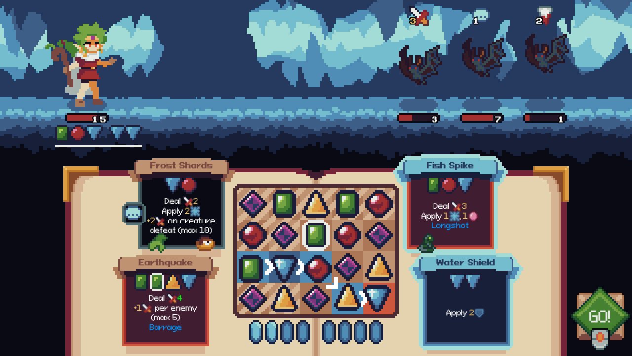 Каждая битва в игре Witching Stone начинается на волшебной доске, где вы прокладываете путь для заклинаний, которые активируются при прохождении маршрута через определенные символы. Тщательно продумывайте свою траекторию, аккуратно соединяйте заколдованные элементы и адаптируйтесь к изменениям на боевой арене, так как ваши противники будут постоянно атаковать и вмешиваться в ваши заклинания, меняя порядок знаков и накладывая проклятья, что усложняет вашу задачу.