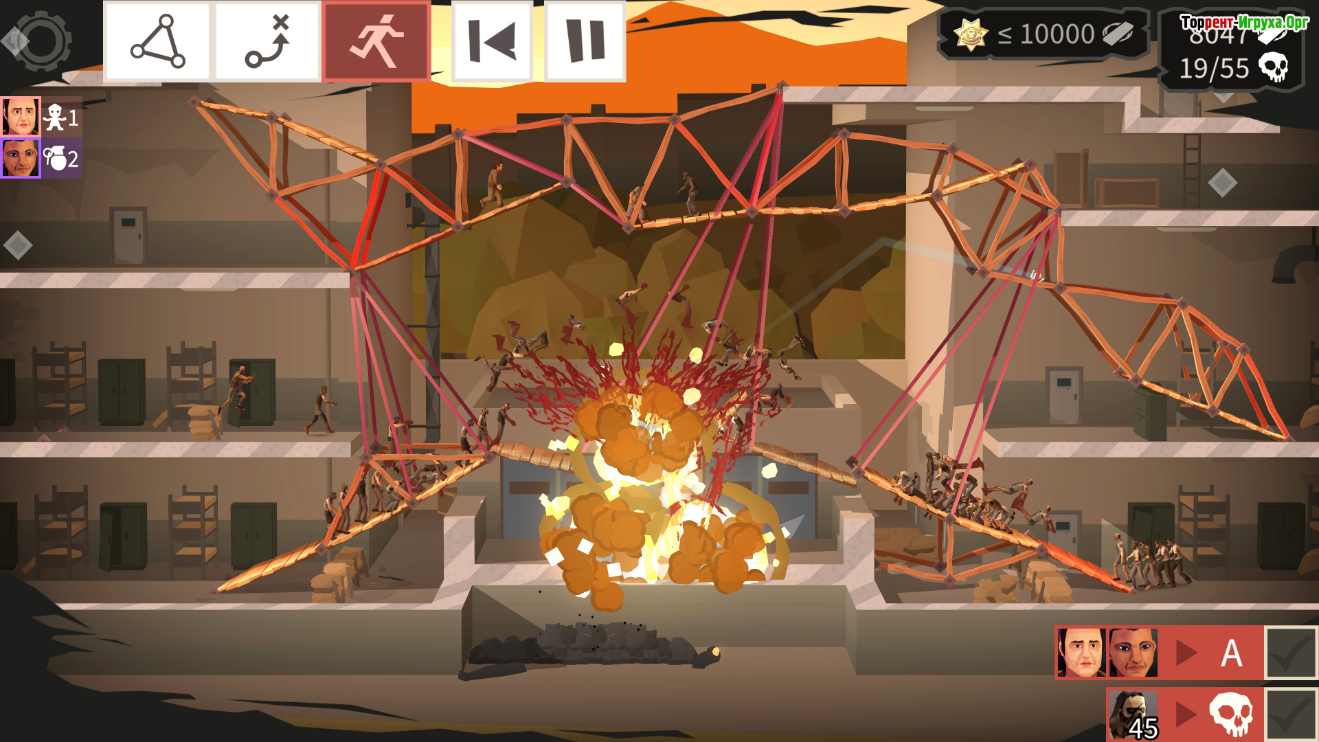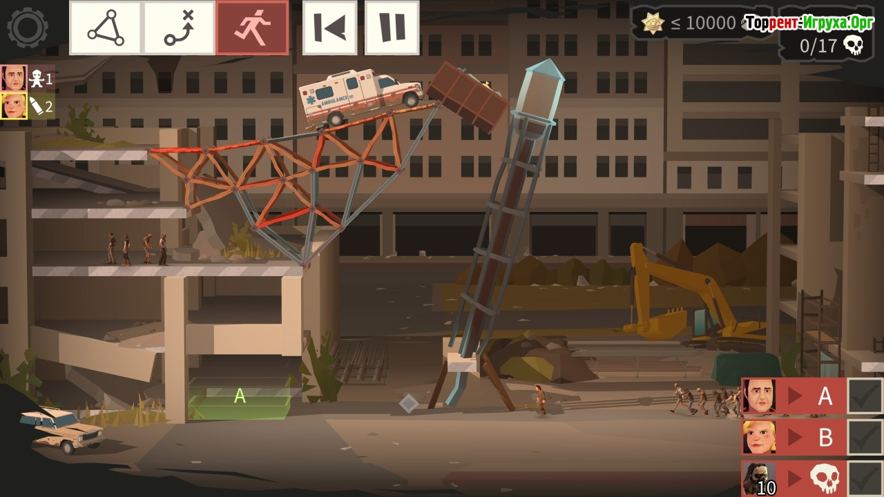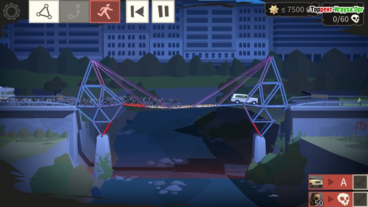 Игра Bridge Constructor The Walking Dead от разработчика ClockStone, выпущенная в 2020 году, предлагает уникальное сочетание тематики зомби и инженерного симулятора. Здесь вам предстоит выступить в роли конструктора из вселенной «Живые мертвецы» и создавать надежные мосты, по которым будут перемещаться герои, избегая угроз со стороны зомби. С первых уровней становится понятно, что задача требует продуманного подхода и умения эффективно использовать ресурсы для строительства безопасных переходов.