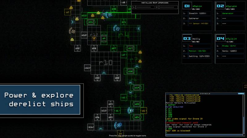 Ключевые особенности игры включают в себя возможность управления дроном через командную строку, изучение процедурной генерации кораблей и окружающего пространства, а также возможность улучшения дрона с помощью найденных обломков. В корабельных журналах вы найдете записи о произошедших событиях, что добавляет глубины вашему приключению.