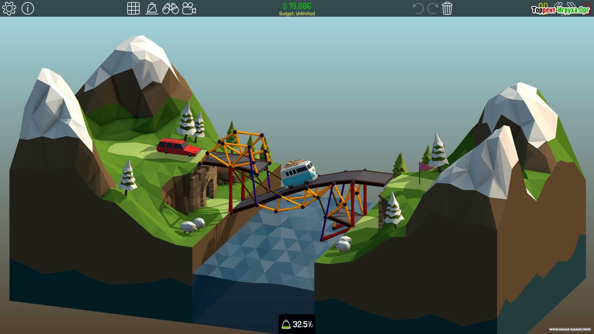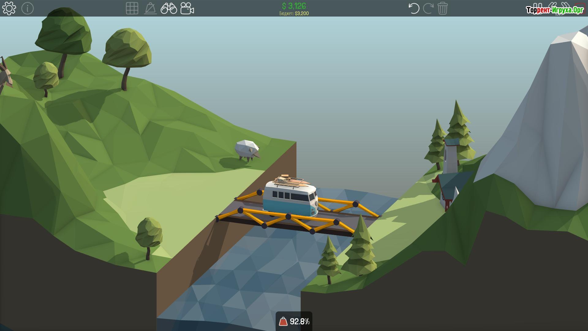 Poly Bridge от разработчика Dry Cactus, выпущенная в 2016 году, представляет собой увлекательный симулятор строительства мостов, где главная цель – создать прочные конструкции для безопасного движения транспорта. В процессе игры вы получите ограниченный набор материалов для строительства, чтобы обеспечить надежные маршруты для различных транспортных средств — от легких мопедов до массивных грузовиков.