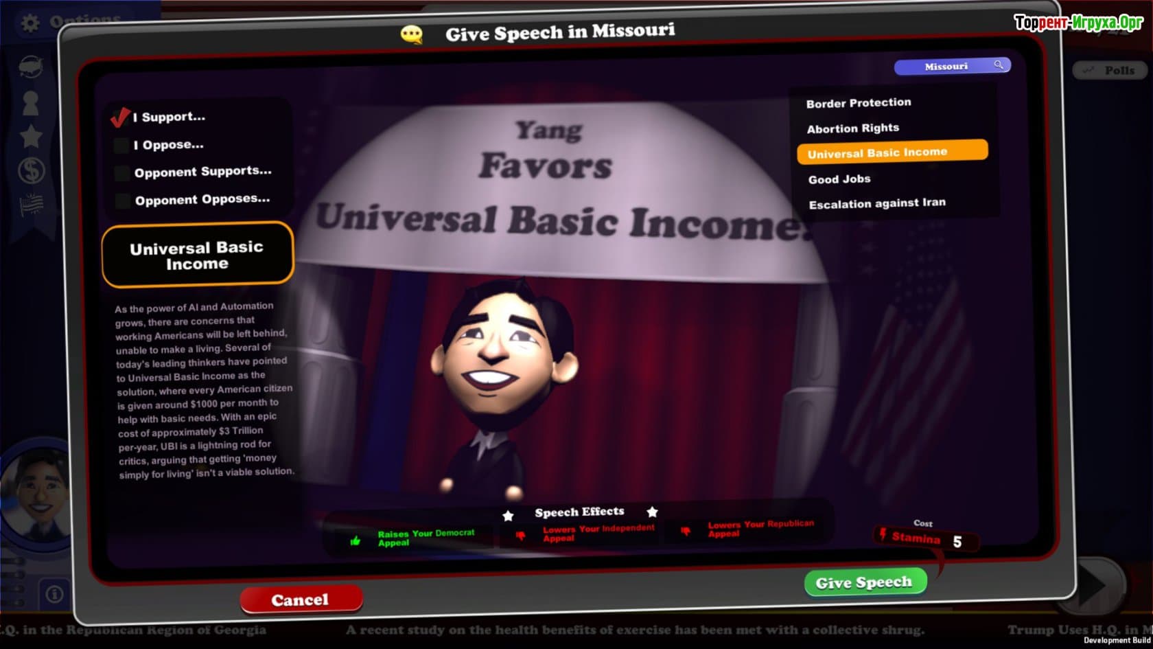 В этой игре вы сможете полностью погрузиться во внутренние механизмы политической кампании, стремясь завоевать доверие избирателей и превзойти соперников. The Political Machine 2020 ставит перед игроком задачу тщательно планировать агитацию, изучать поведение конкурентов и активно повышать собственную популярность, чтобы стать лидером президентской гонки.