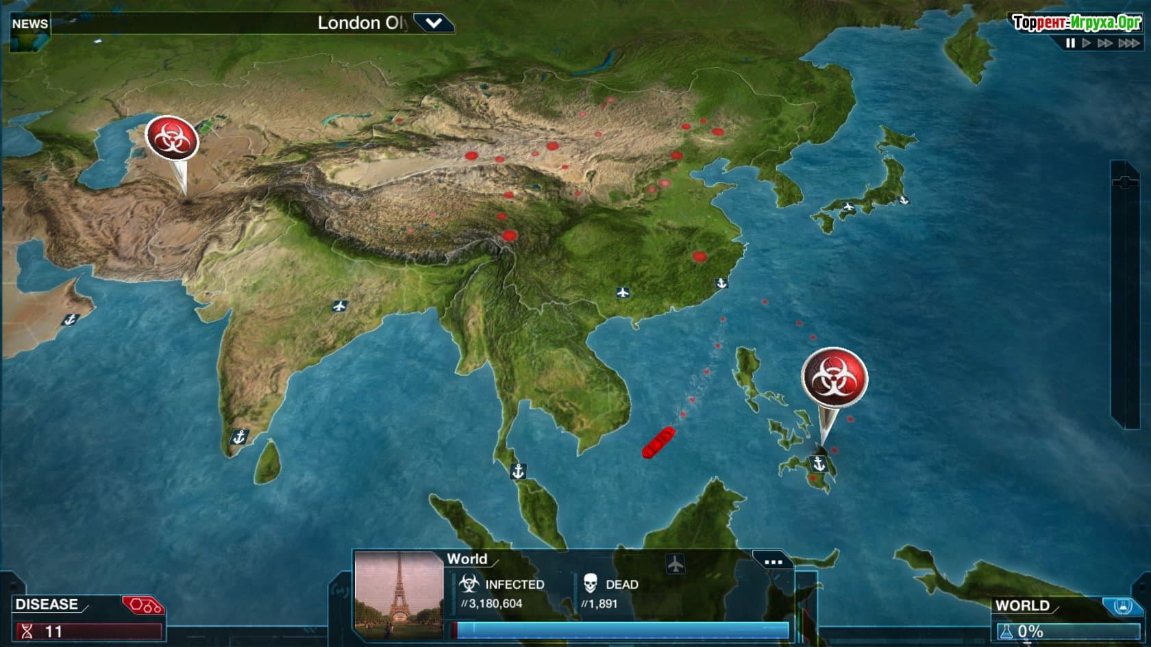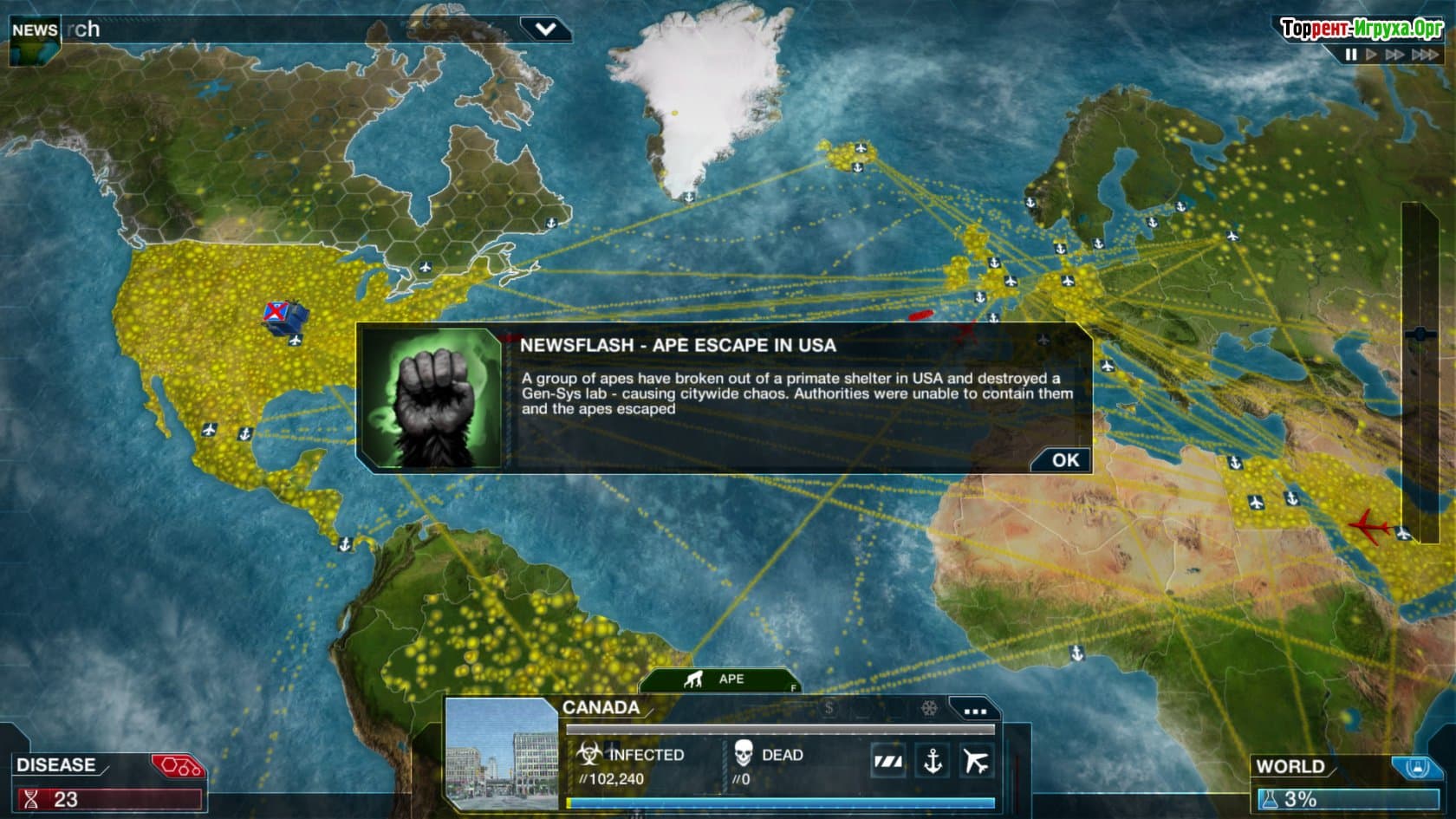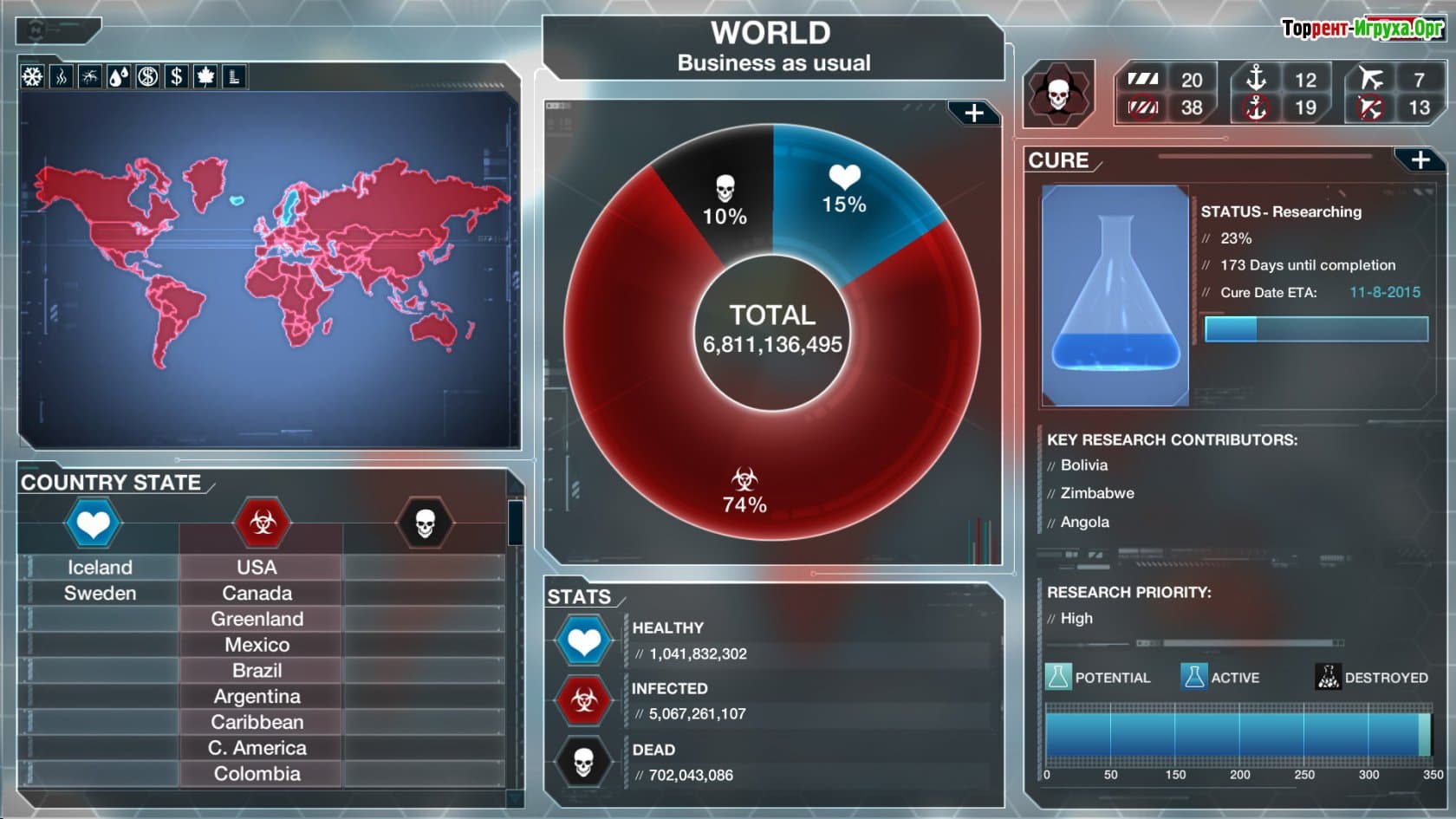 Plague Inc Evolved — это уникальная стратегия от разработчика Ndemic Creations, выпущенная в 2016 году, которая погружает вас в мир биологических угроз. В этой игре вы станете создателем смертоносных вирусов, цель которых — заразить и уничтожить максимальное количество населения планеты. Вам предстоит контролировать распространение болезни, чтобы охватить все регионы мира и добиться полного эпидемического охвата.