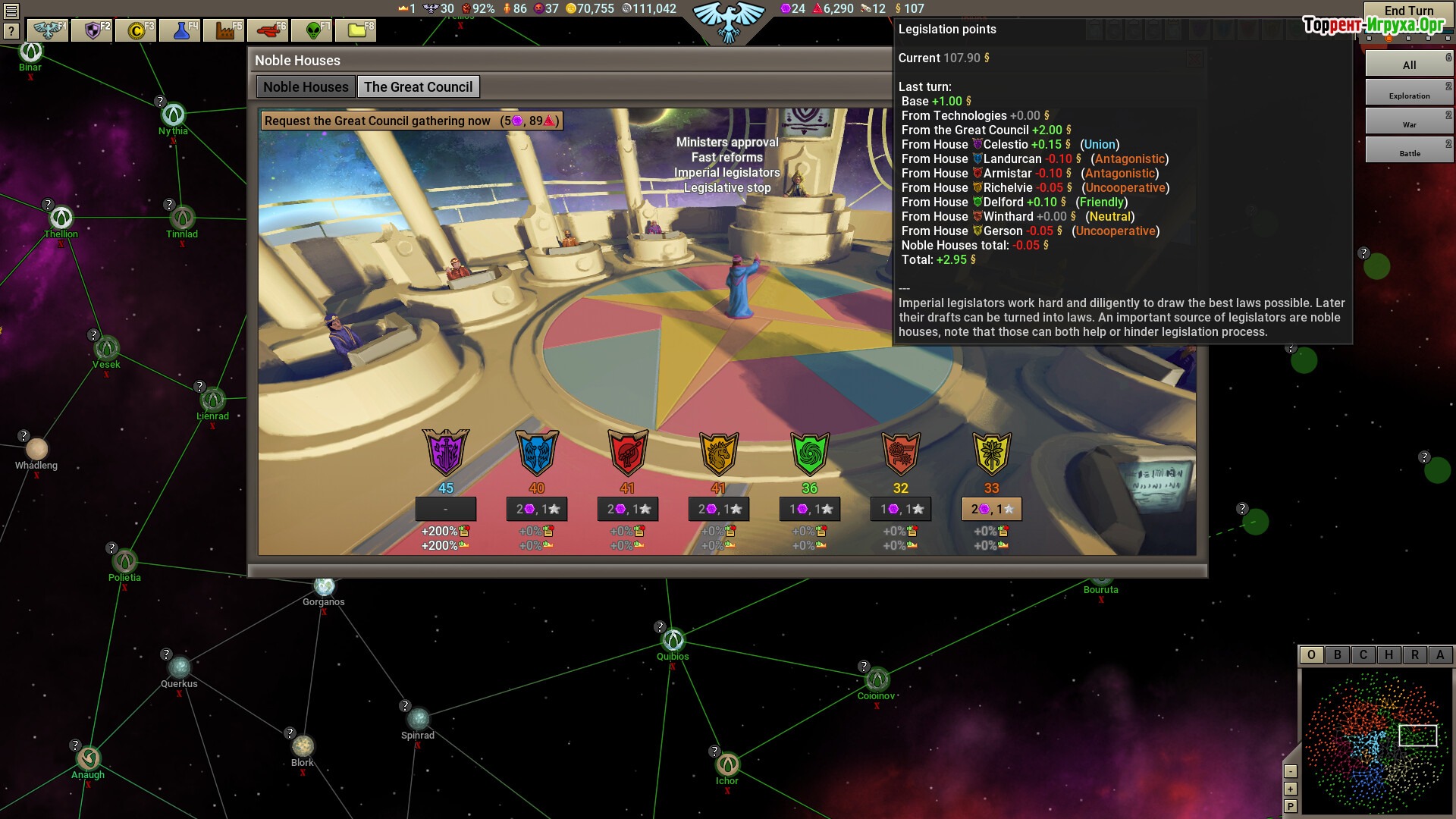 В основе геймплея лежит пошаговая 4X-стратегия, где вам предстоит контролировать развитие империи и принимать важные решения на государственном уровне. В Stellar Monarch 2 вы назначаете советников, боретесь с предателями и управляете дворянством, а не занимаетесь мелкими вопросами вроде строительства ферм или кораблей. Такой подход позволяет сконцентрироваться на глобальной политике и управлении феодальной системой в космосе.