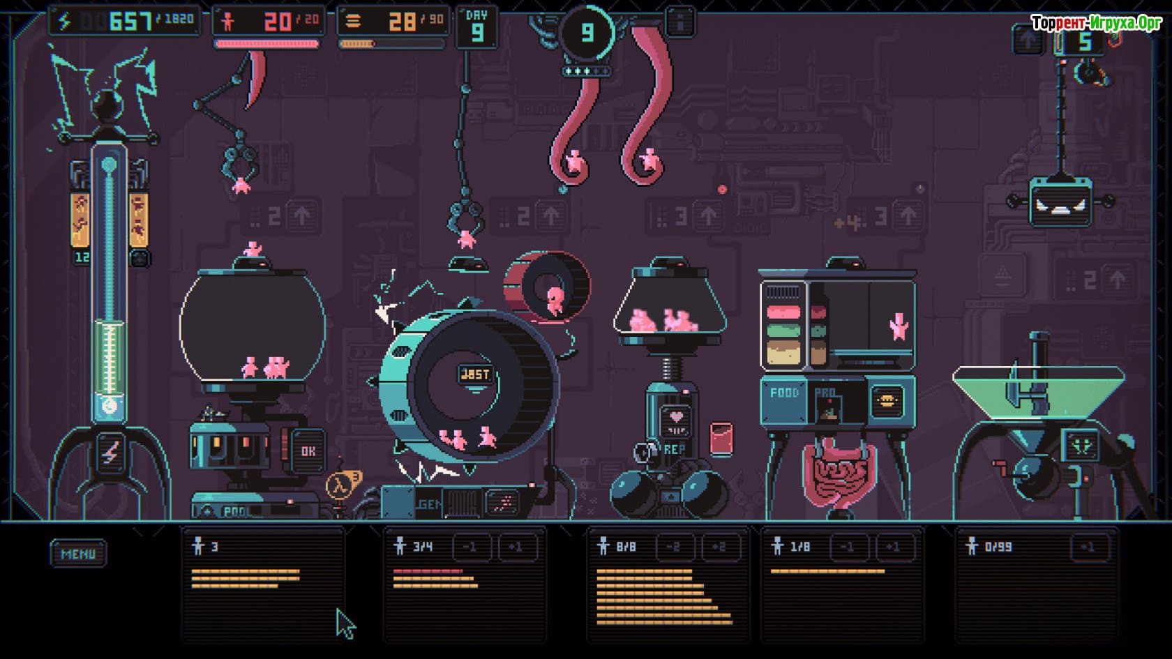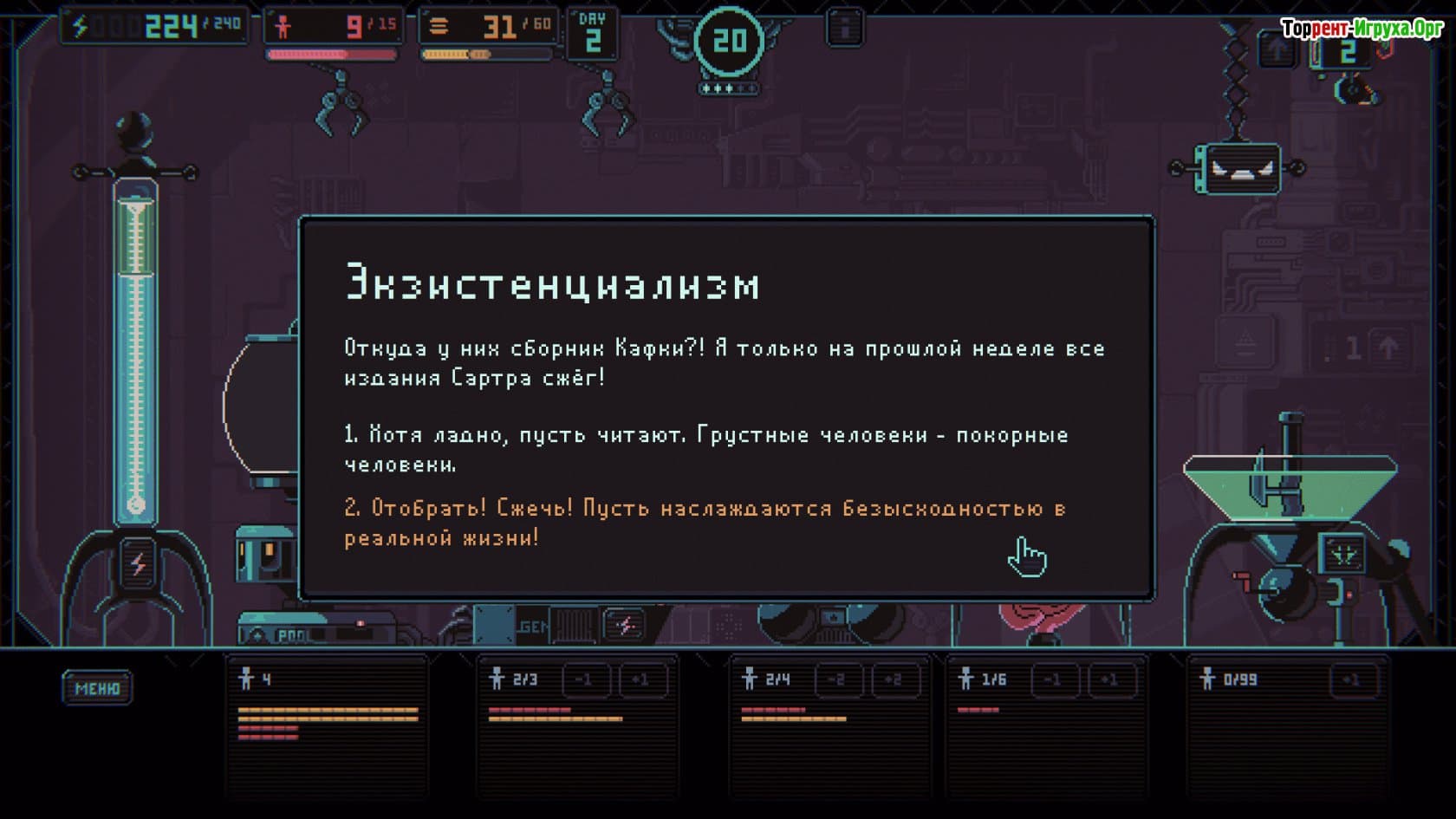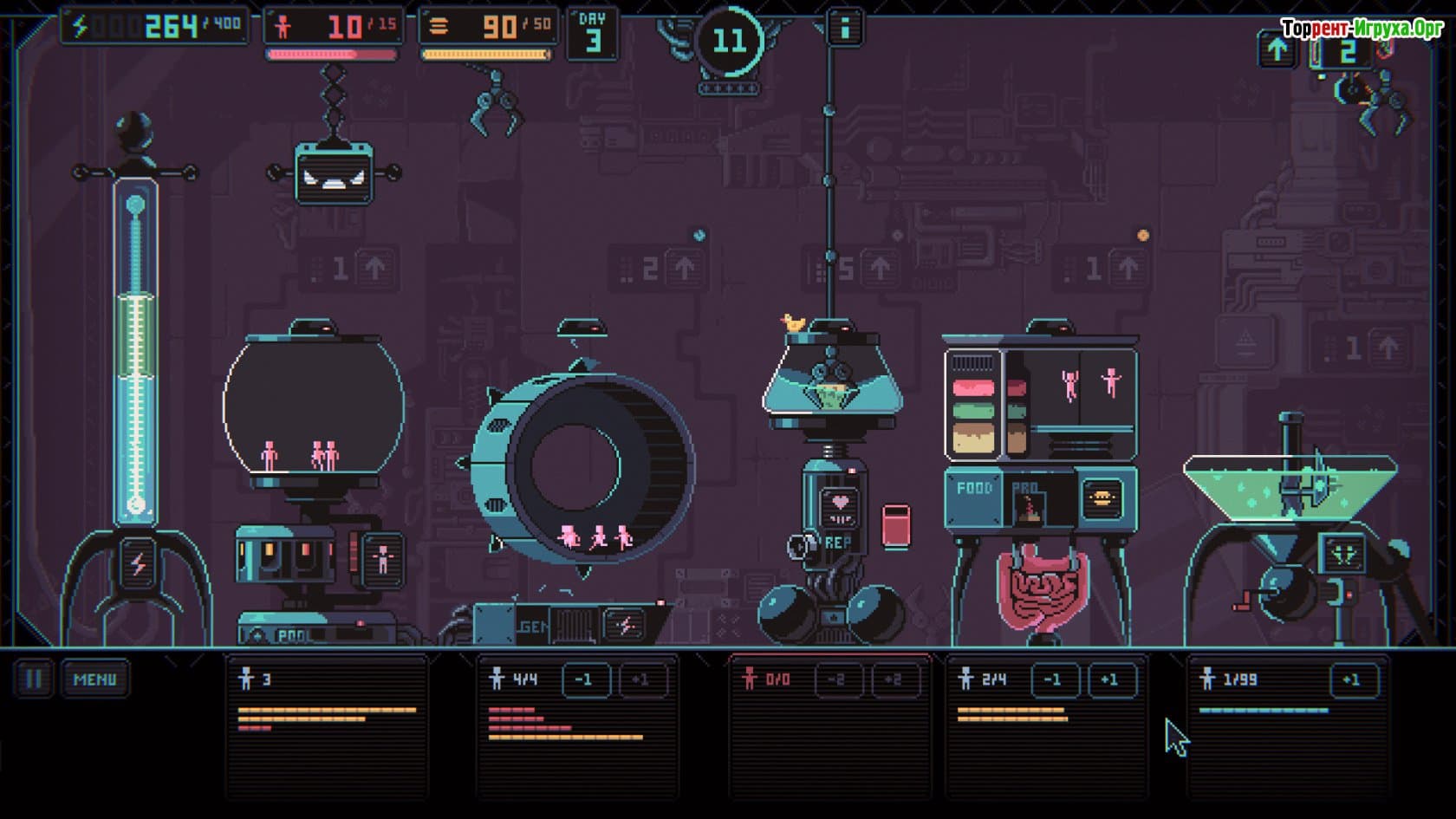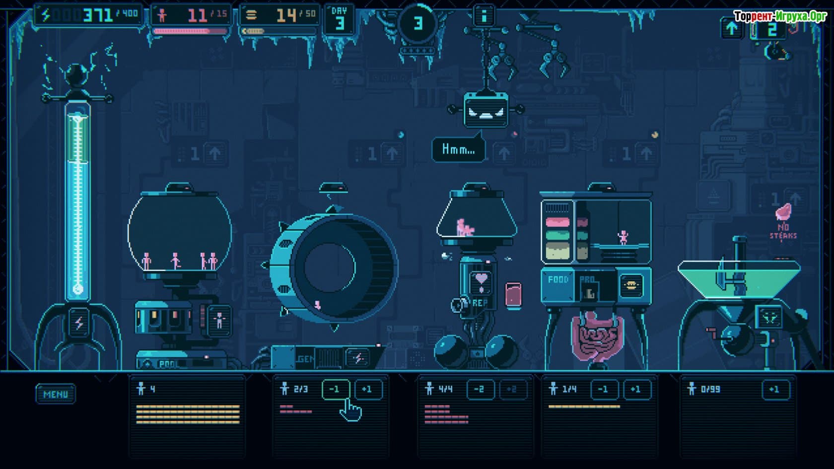 В процессе игры важно грамотно распределять человеческие ресурсы, контролировать состояние подопечных и стимулировать их размножение, при этом избавляясь от ненужных элементов. Сбалансированный подход и тонкое управление помогут вывести новый вид людей, превосходящий всех по своим характеристикам и беспрекословно подчиняющийся искусственному интеллекту. При этом возникают разнообразные внештатные ситуации, которые требуют от вас продуманных решений и стратегического мышления.