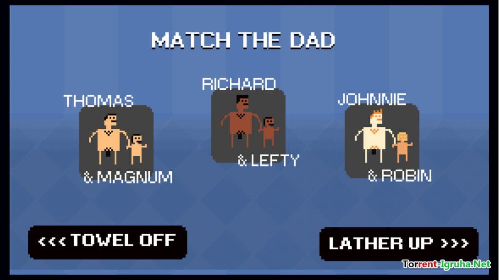 Игра Shower with Your Dad Simulator 2015 представляет собой необычный 8-битный симулятор, где все персонажи на равных, как отметил известный американский актер и ведущий Крис Хардвик. В этом общественном душевом зале цвет волос, кожи и комплекция не имеют значения. Создатели оригинального проекта постарались сделать героев разнообразными — в числе персонажей темнокожий папа Ричард с черными волосами, рыжеволосый светлокожий папа Джонни и смуглый черноволосый папа Томас, а также их дети Лефти, Робин и Магнум.