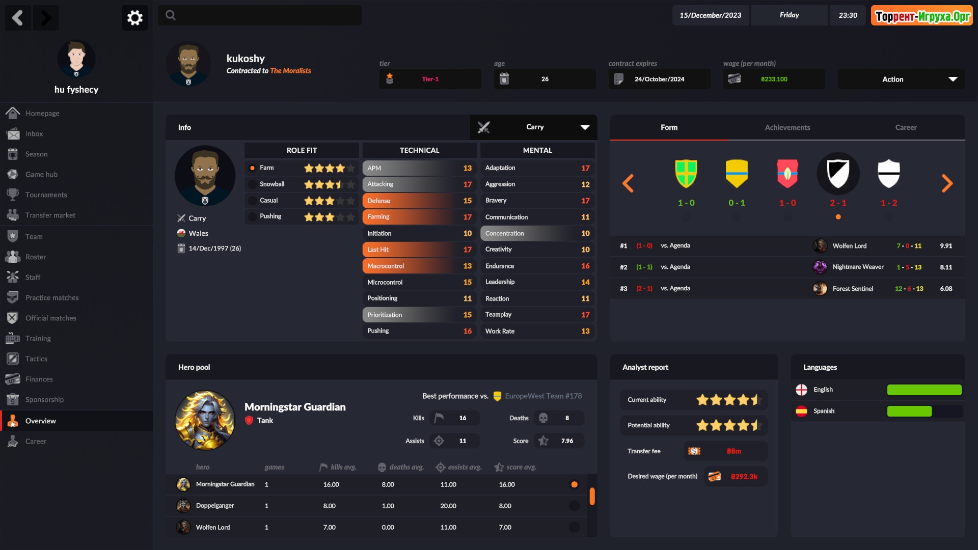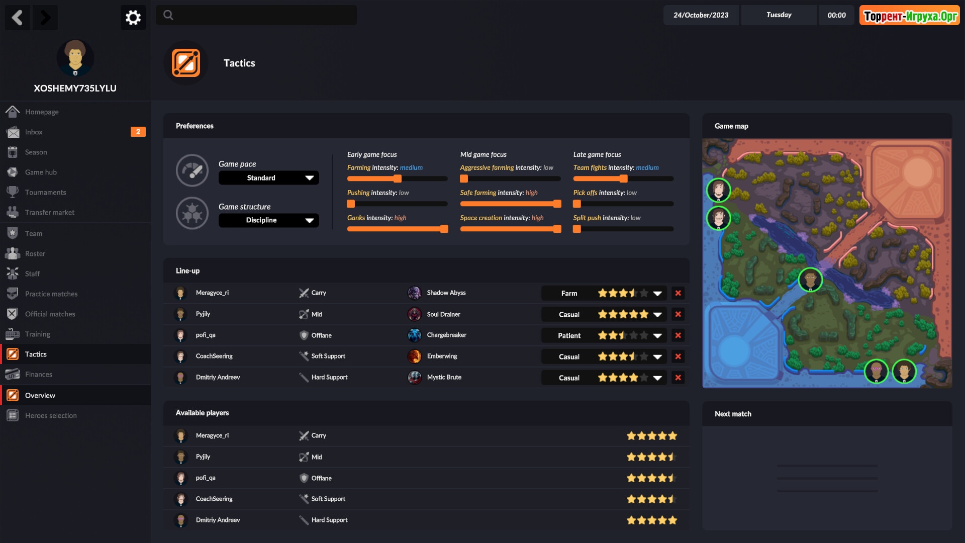 eSports Manager предлагает уникальную возможность стать руководителем собственной киберспортивной организации. В этом симуляторе вы сможете нанимать игроков, расширять команду и управлять тренировочным процессом, а также стратегией. Ваша цель – вывести коллектив на вершину мирового рейтинга и сделать его лидером в мире киберспорта.