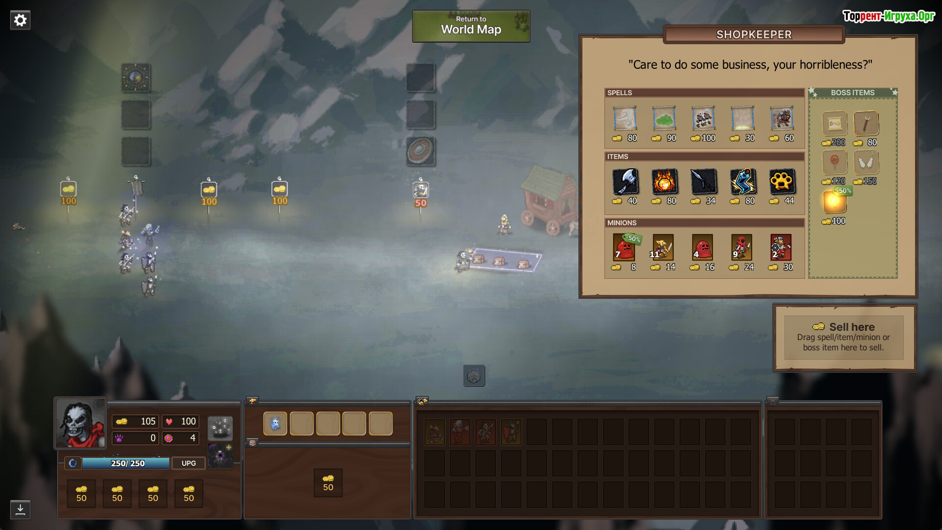 В начале каждого прохождения выбирается один из уникальных босс-лордов — правитель с собственной историей, стартовыми войсками, набором заклинаний и деревом улучшений. Например, гоблинский генерал делает ставку на численность и дисциплину, превращая простых воинов в опытных бойцов. Некромантка контролирует отряды нежити, восстающих после каждого боя, а маг и укротительница драконов работают с призывом мощных и редких существ. Такая разнообразная армия и тактический подход делают каждый выбор значимым и влияют на стиль прохождения.