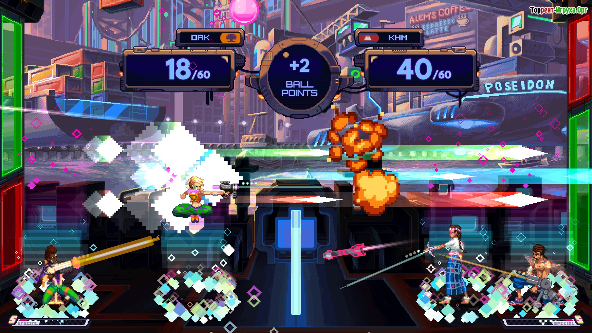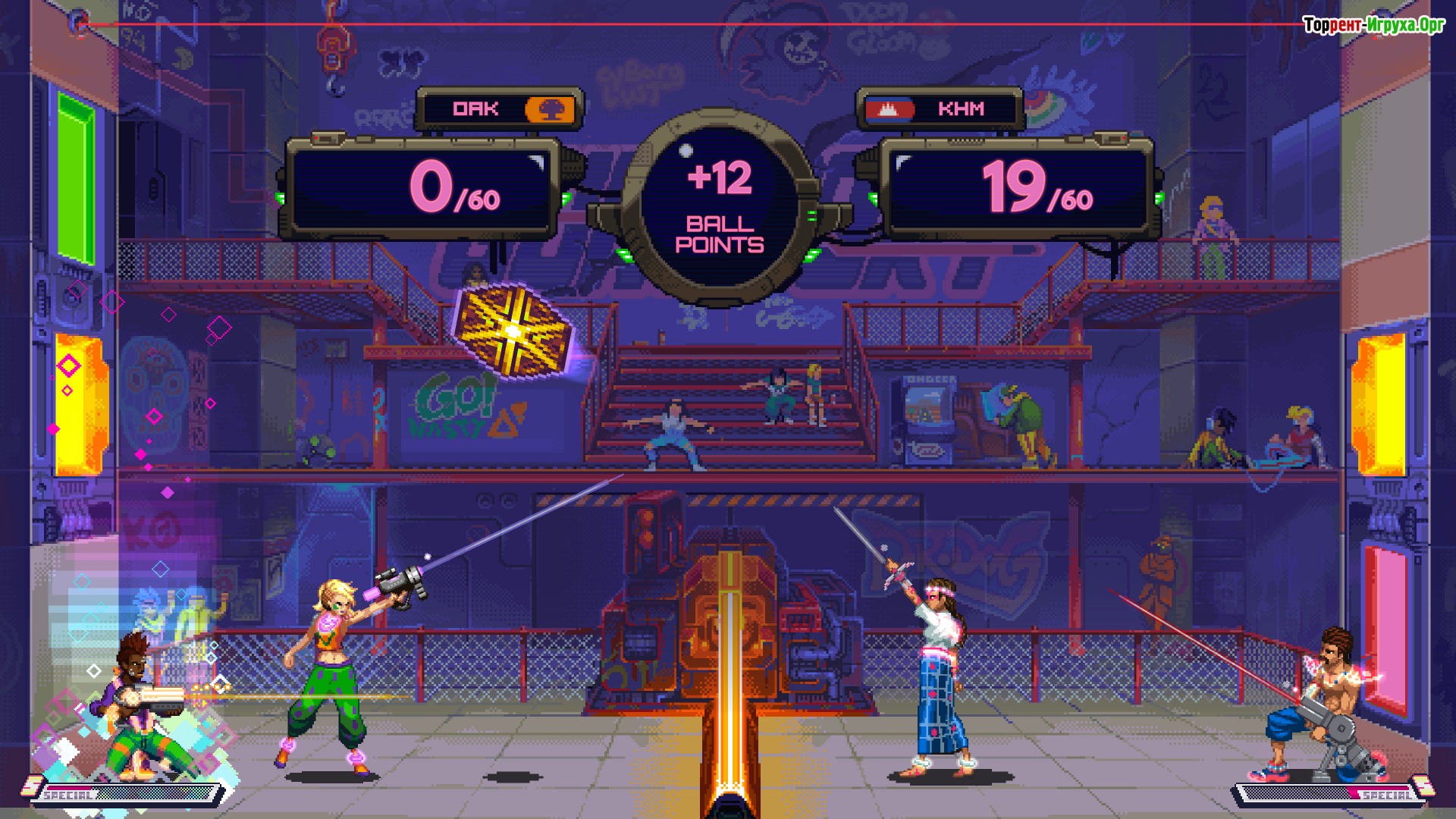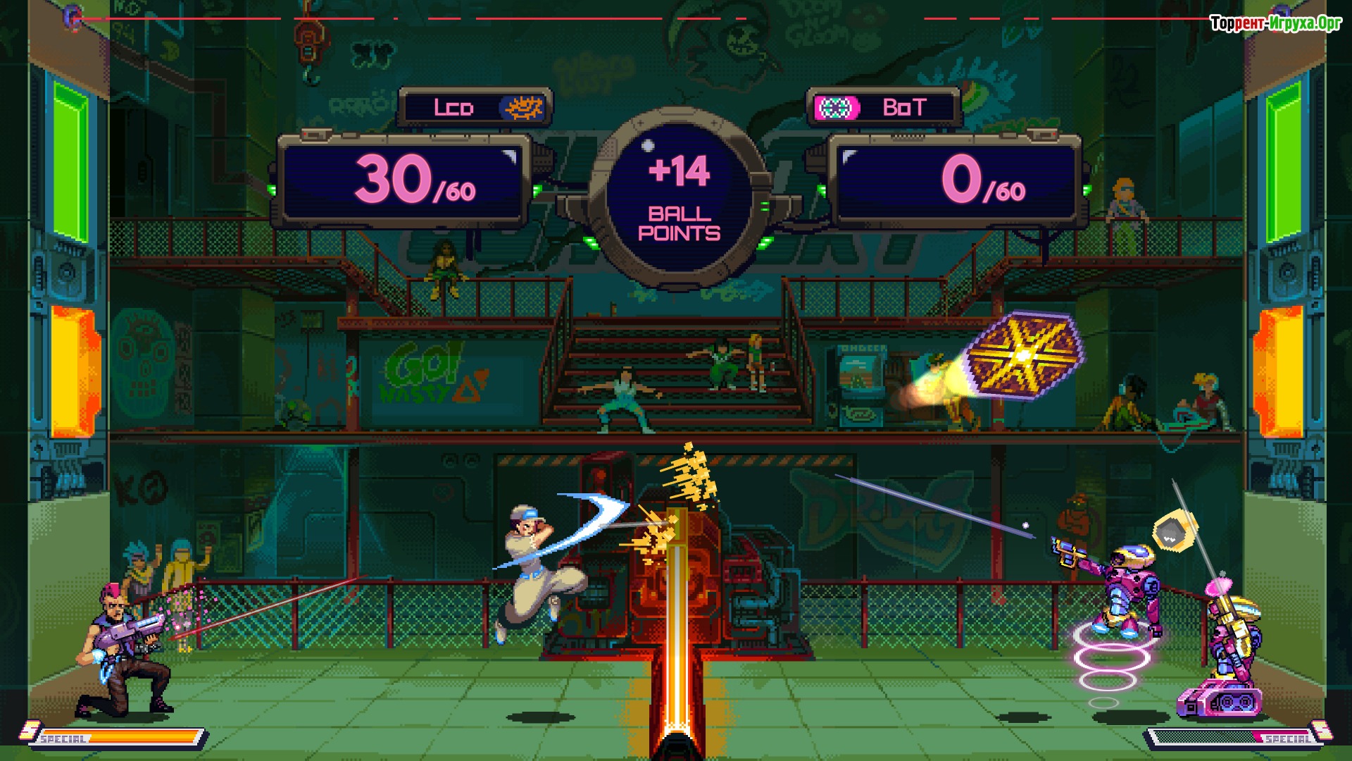 Hyper Gunsport предлагает окунуться в классический экшен с аркадным геймплеем, где главным элементом является мяч, способный дарить невероятные прыжки, сильные удары и интенсивные перестрелки. Эта кооперативная соревновательная игра сочетает элементы динамики и командной работы, заставляя игроков сражаться за попадание мяча в ворота противника.