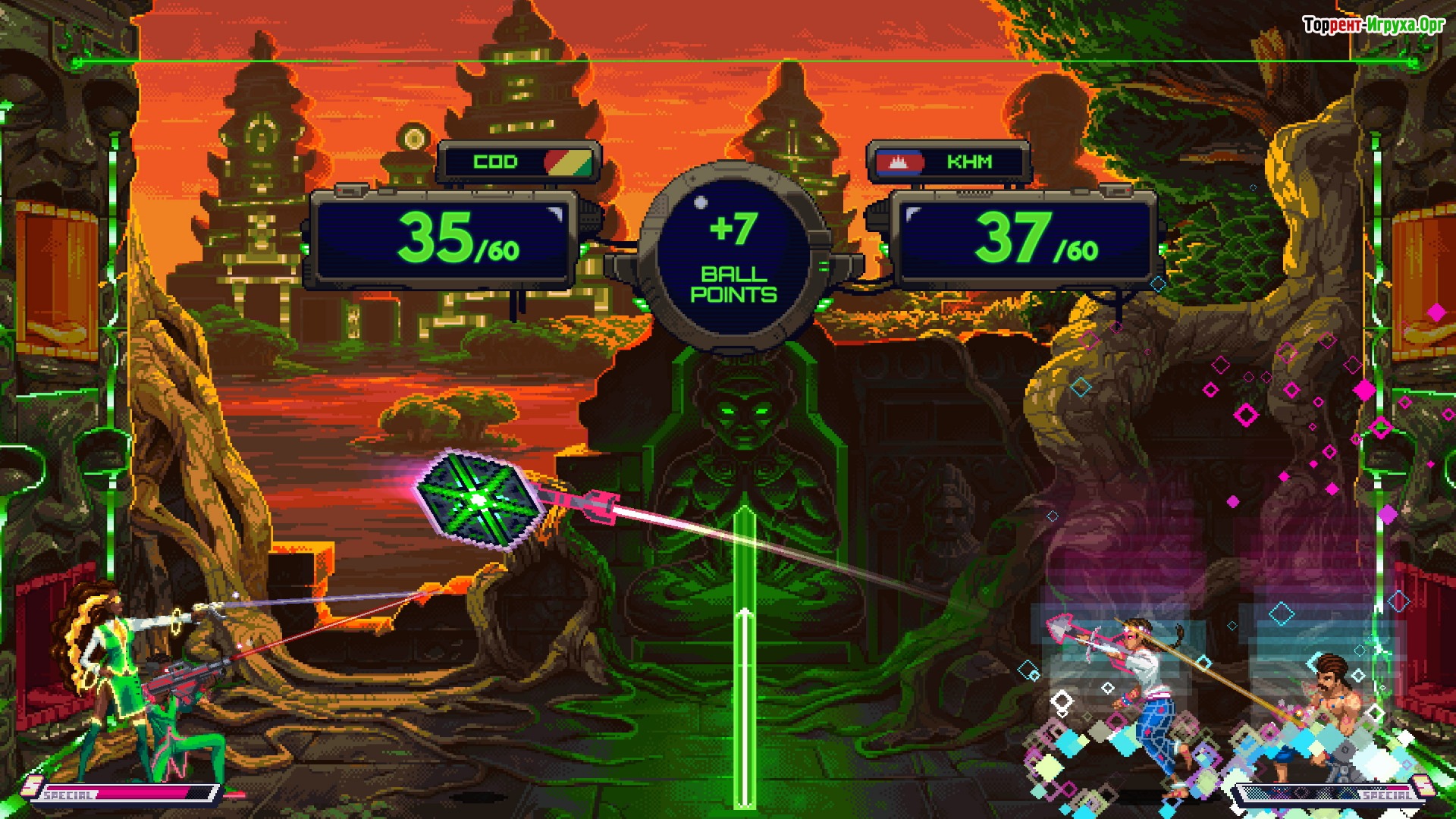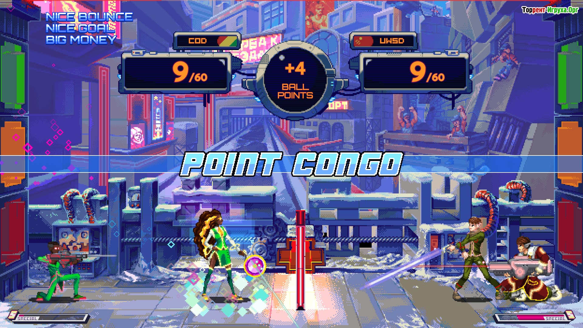 В процессе игры мяч становится всё более ценным при каждом его пересечении сетки, повышая накал борьбы и требуя максимальной концентрации от команд. В составе каждой из них — вратарь и нападающий: первый играет статично, активно используя широкий прицел для точной стрельбы, а второй проявляет ловкость и мобильность, совершая прыжки и перемещения, несмотря на ограниченное количество ударов. Подбор правильной тактики здесь – залог успеха.