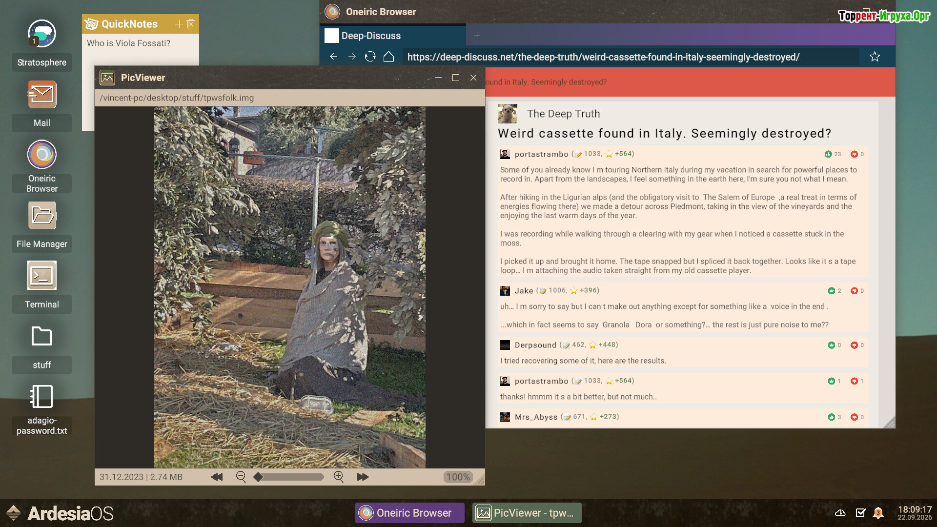 Восстановление записей в Imprinted — это не просто технический процесс очистки шума и возвращения звука к жизни. Каждая кассета оказывается наполнена частями жизни Виолы Фоззати: её экспериментальной музыкой, загадочными паузами и искажёнными голосами, которые создают мрачный и тревожный портрет исчезнувшей певицы с увлечением оккультизмом. Звуковое повествование заставляет задуматься о том, как звук влияет на восприятие реальности.