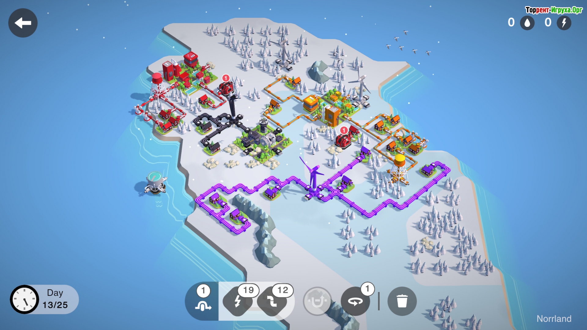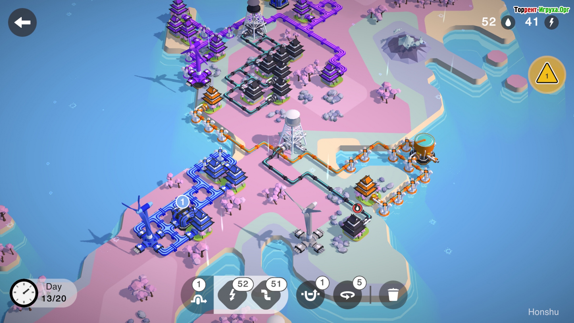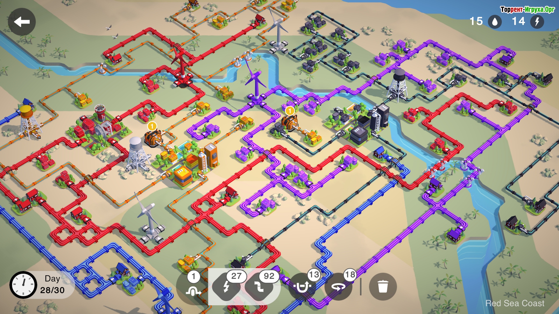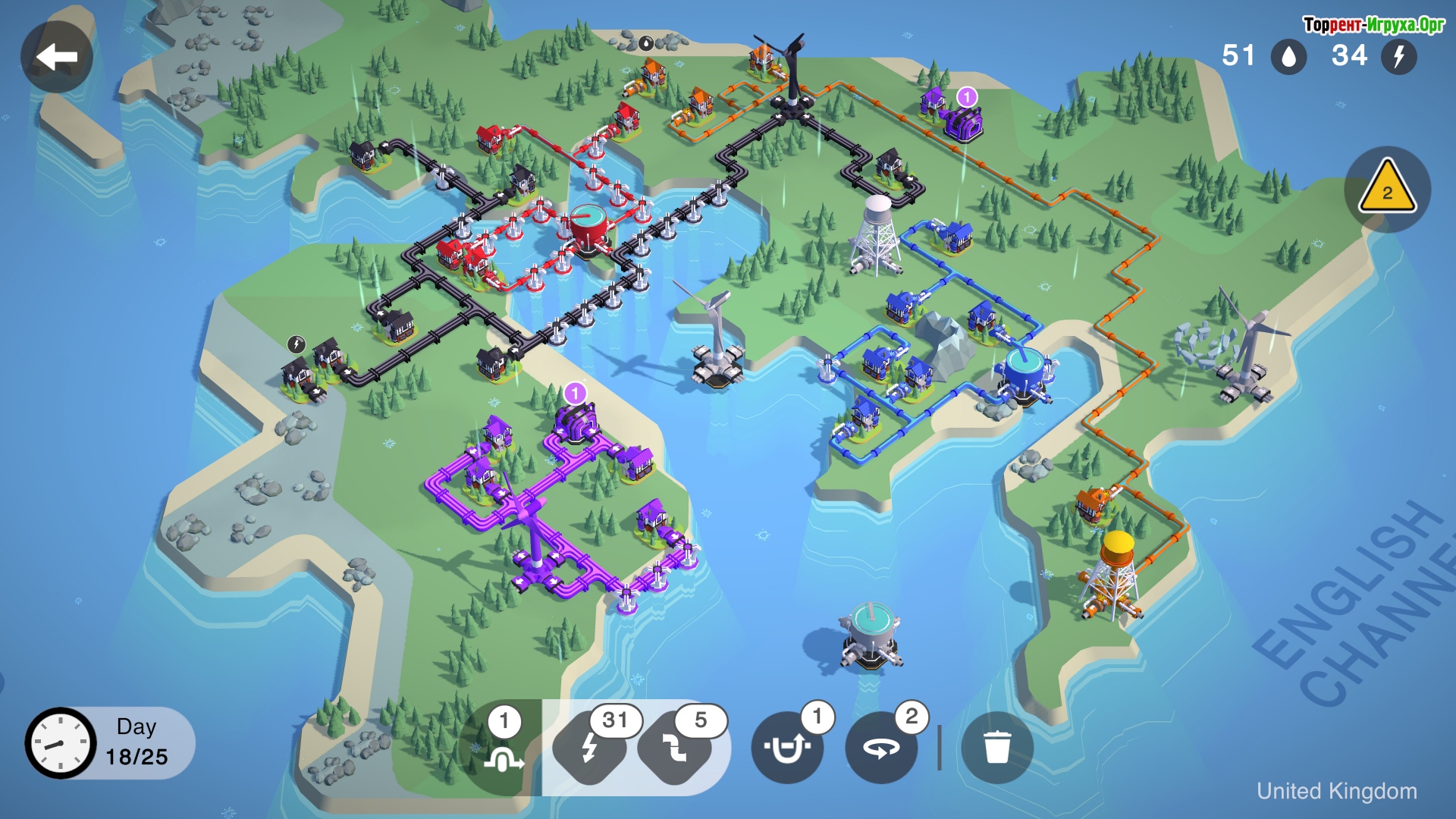 Игровое поле выполнено в виде сетки, на которой случайным образом появляются здания и дома разного цвета. Каждый дом требует подключения к ресурсу своего цвета, что добавляет глубину и стратегию процессу. Необходимо тщательно продумывать маршруты труб и линий электропередач, используя ограниченное количество доступных элементов и время с максимальной эффективностью.