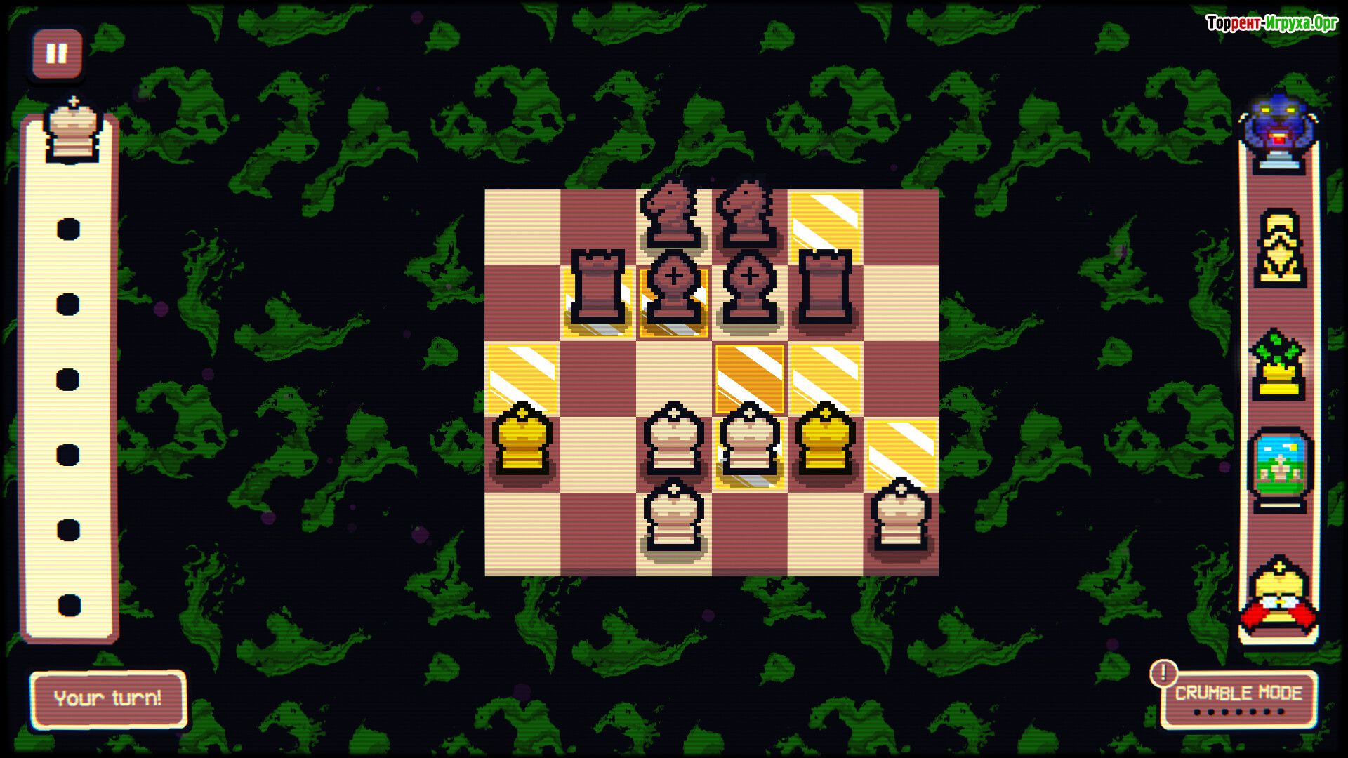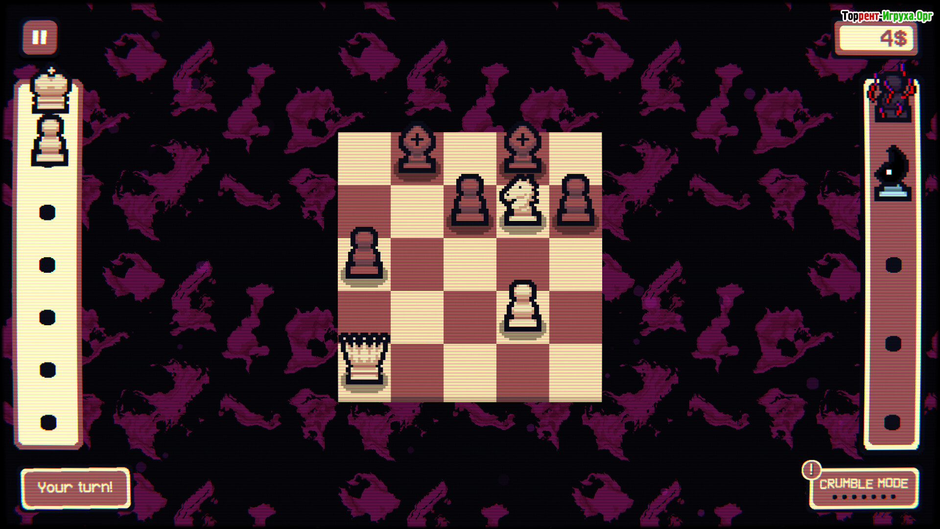 С каждым новым уровнем противники становятся всё более сложными, включая уникальных боссов, которые требуют гибкости и тщательного планирования. Ограниченное количество ходов подталкивает к решительным действиям, а система запаса фигур позволяет в нужный момент изменять расстановку сил и удивлять оппонента новыми тактическими ходами. Победы достигаются не механическим знанием классических шахмат, а продуманной игрой на синергиях и тактических возможностях.
