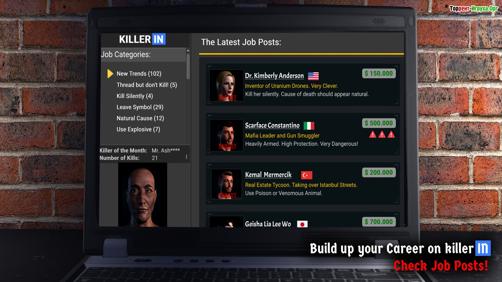 Hired - Assassin Simulator предлагает игрокам окунуться в мир наемного убийцы, где креативность в методах устранения целей стоит на первом месте. В этой игре можно выбрать разнообразные способы уничтожения — от ядовитой змеи до точного удара меча ниндзя, а также устроить автокатастрофу или применить ракетницу. Такие варианты делают игровой процесс захватывающим и нестандартным, позволяя каждому найти свой стиль в симуляторе наемного убийцы.