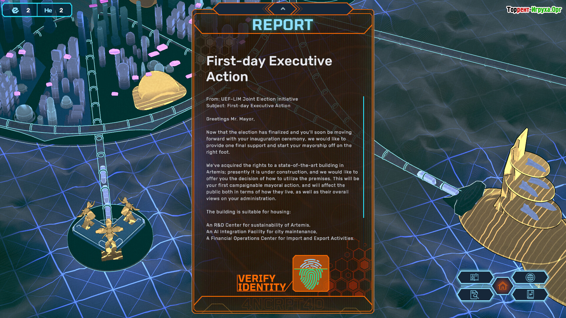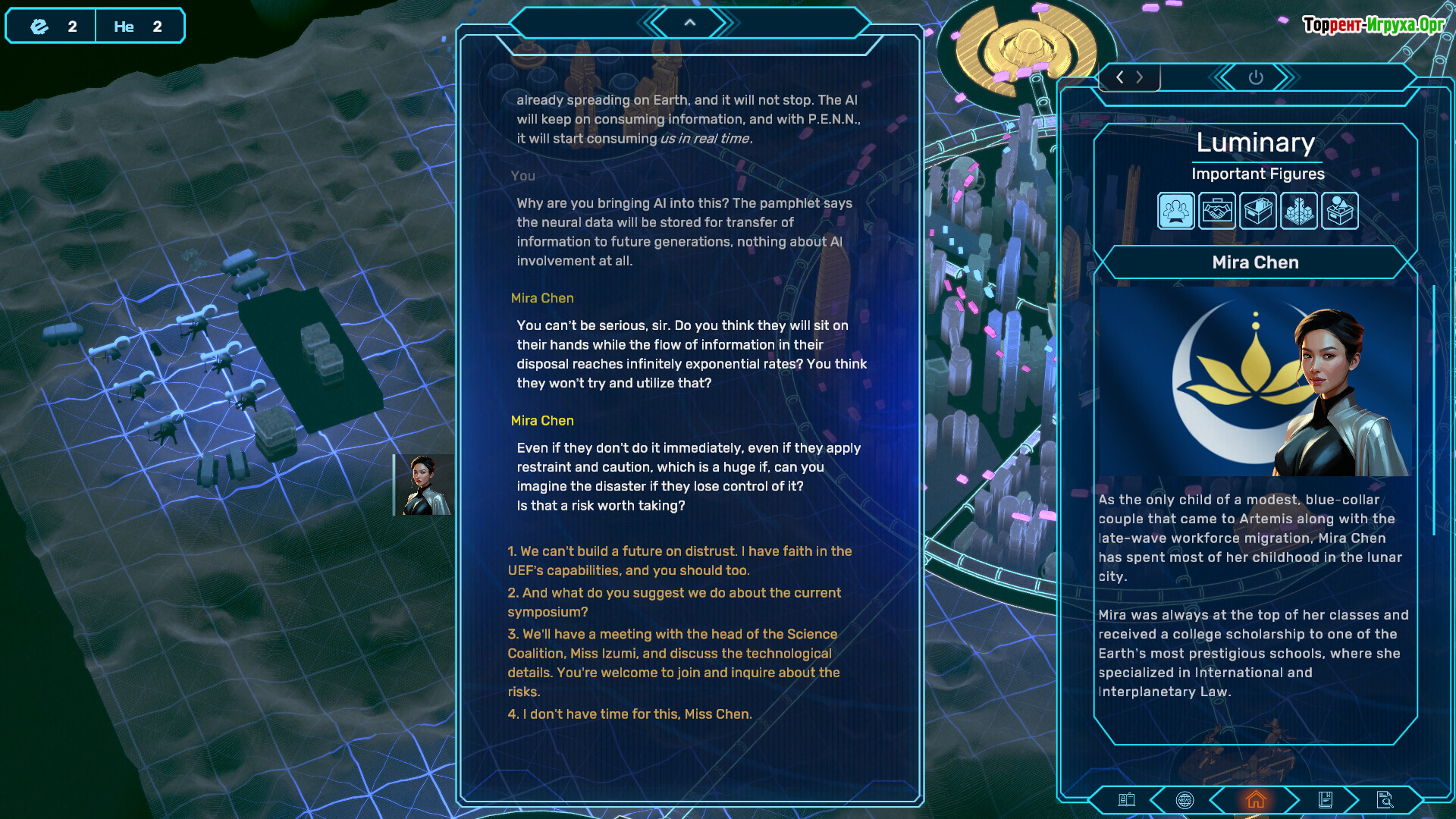 В мире, где Федерация Земли передала управление человечеством Абсолютному Искусственному Интеллекту AIA, Артемис стала оазисом свободы, где власть принадлежит людям. В роли мэра вы столкнетесь с необходимостью уравновешивать давление со стороны Федерации, внутренние конфликты колонии и растущее недоверие к ИИ, принимая решения, которые определят дальнейшее развитие общества.