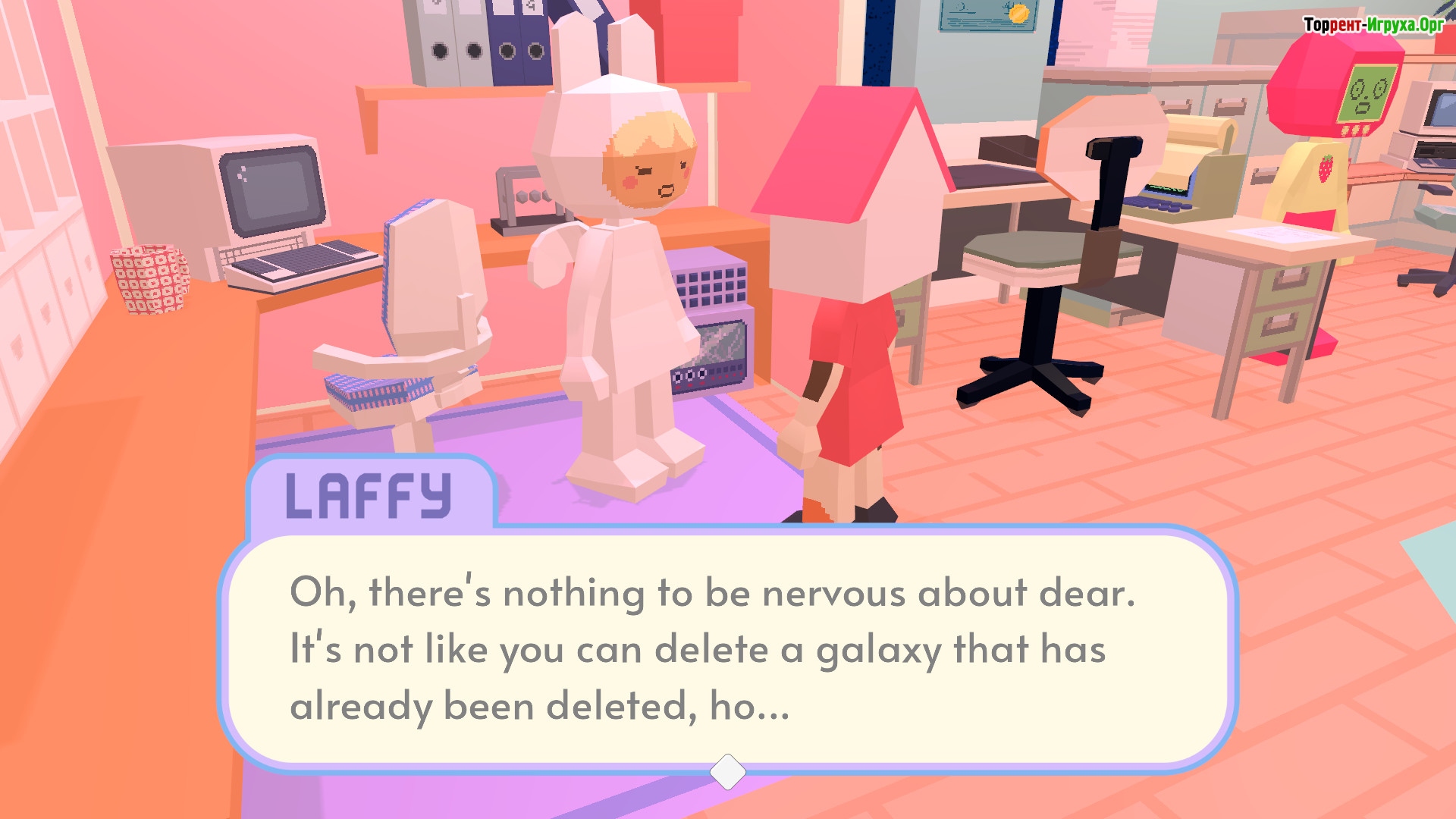 Особенность игры заключается в том, что каждая планета обладает своими уникальными правилами и характеристиками. Пользователи получают доступ к специальному ПО для проектирования планет, где нужно размещать плитки по цвету или по количеству деревьев на них. Помимо этого, вы можете исследовать офис и заводить дружеские отношения с коллегами, постепенно раскрывая загадочный секрет уничтожения галактики.