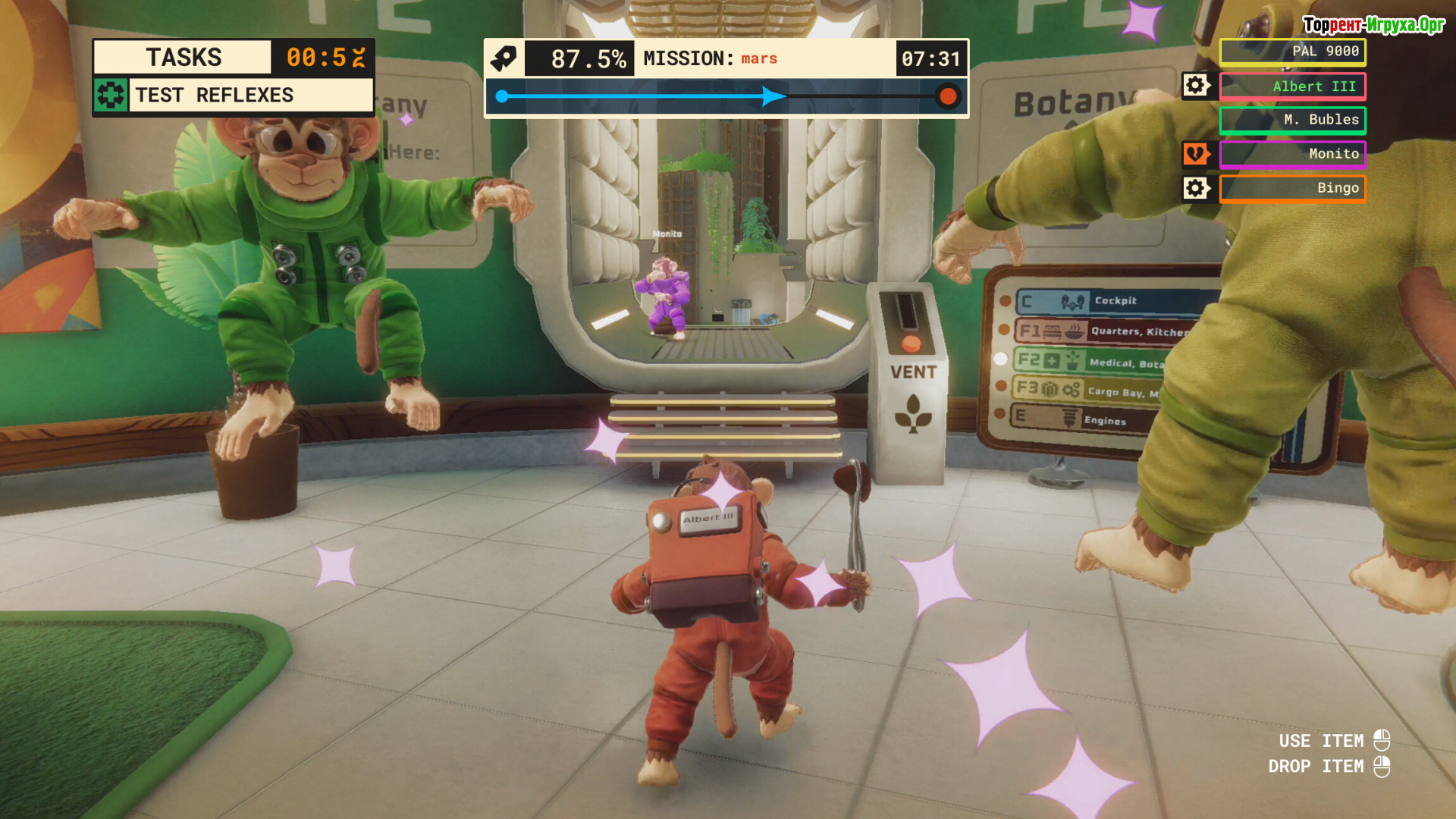 Go Ape Ship — захватывающая кооперативная игра о выживании в космосе, где команда астрошимпанзе должна удерживать корабль в исправном состоянии. В процессе игрового действия предстоит справляться с множеством динамичных мини-игр, случайными поломками и вызовами, способными превратить миссию в полную хаоса и веселья ситуацию с бананами, летающими по всему отсеку.