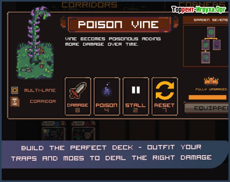 Игровая механика включает в себя около шести видов башен с возможностью улучшения и уникальными технологиями, а также пять различных типов мобов, которые можно использовать в бою. Меняйте состав вашей колоды, сочетая ловушки и мобов, чтобы успешно пройти более 25 волн вражеских атак и расширять свое подземелье, создавая непобедимую оборону.