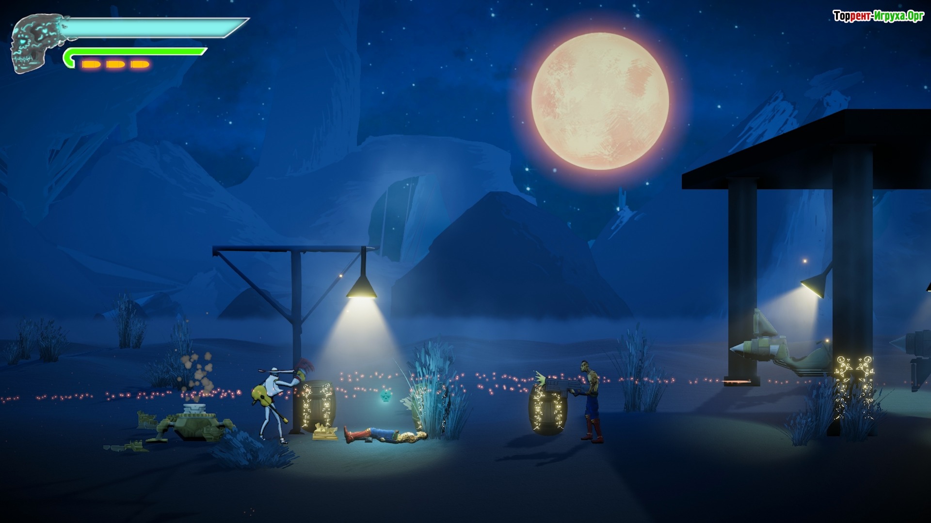 Mariachi Undead — это яркий и динамичный платформер с уникальным стилем, выполненный в технике рисованной графики. Игра совмещает классическую боковую прокрутку с элементами стрелялки, позволяя игрокам использовать гитару или обычный контроллер для управления. Вас ждет насыщенное приключение в необычном игровом мире.