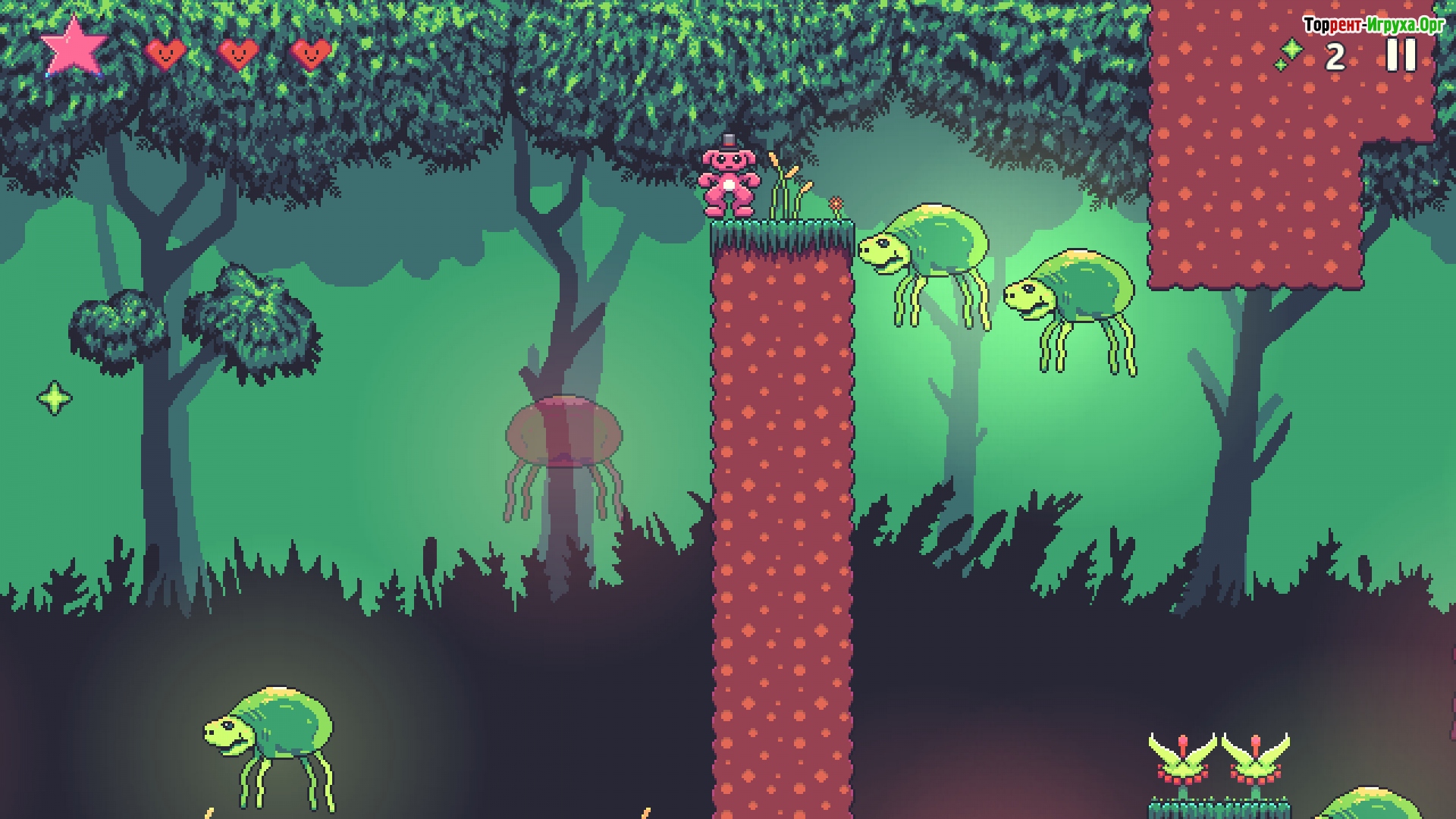 В Floomy отлично сочетается красивая пиксельная графика с разнообразием локаций: в игре пять оригинальных зон и двадцать семь уникальных уровней. Противников здесь несколько типов, что добавляет разнообразия сражениям и стратегии. Этот платформер станет настоящим вызовом для любителей жанра, ценящих сложность и атмосферу.