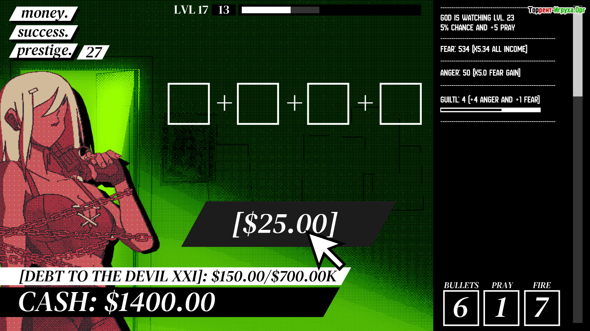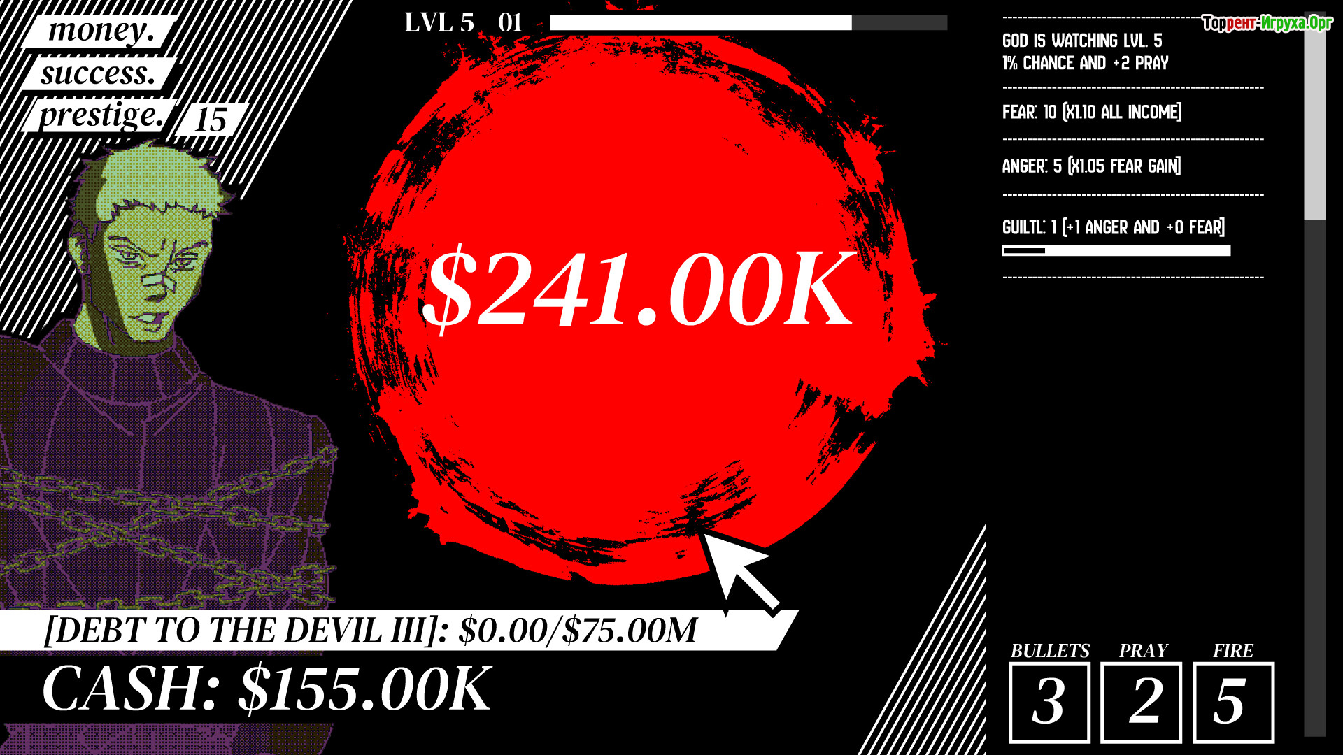 Геймплей начинается с нажатий, генерирующих случайные числа и приносящих доход. По мере прогресса открываются новые методы оптимизации, связанные с насилием и поджогами, которые усиливают скрытые показатели — страх, гнев и вину. Таким образом, рост дохода превращается в цепочку напряжённых решений, где каждое действие сказывается на балансе между эффективностью и моралью.
