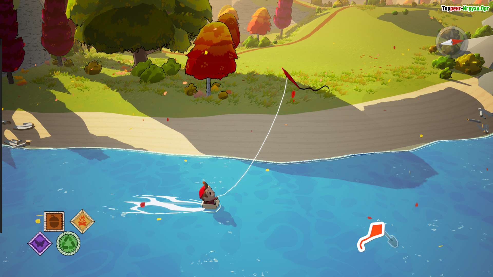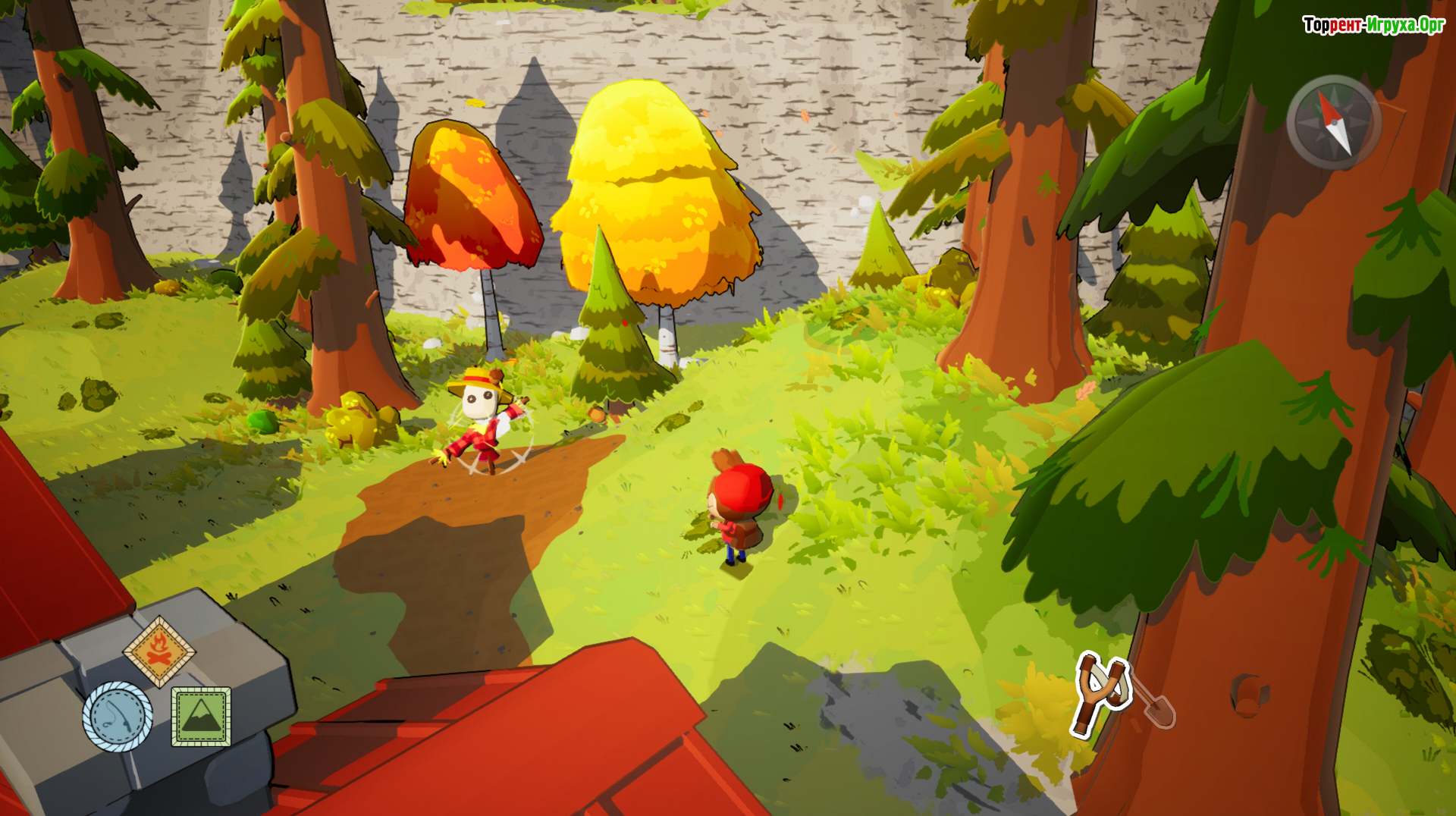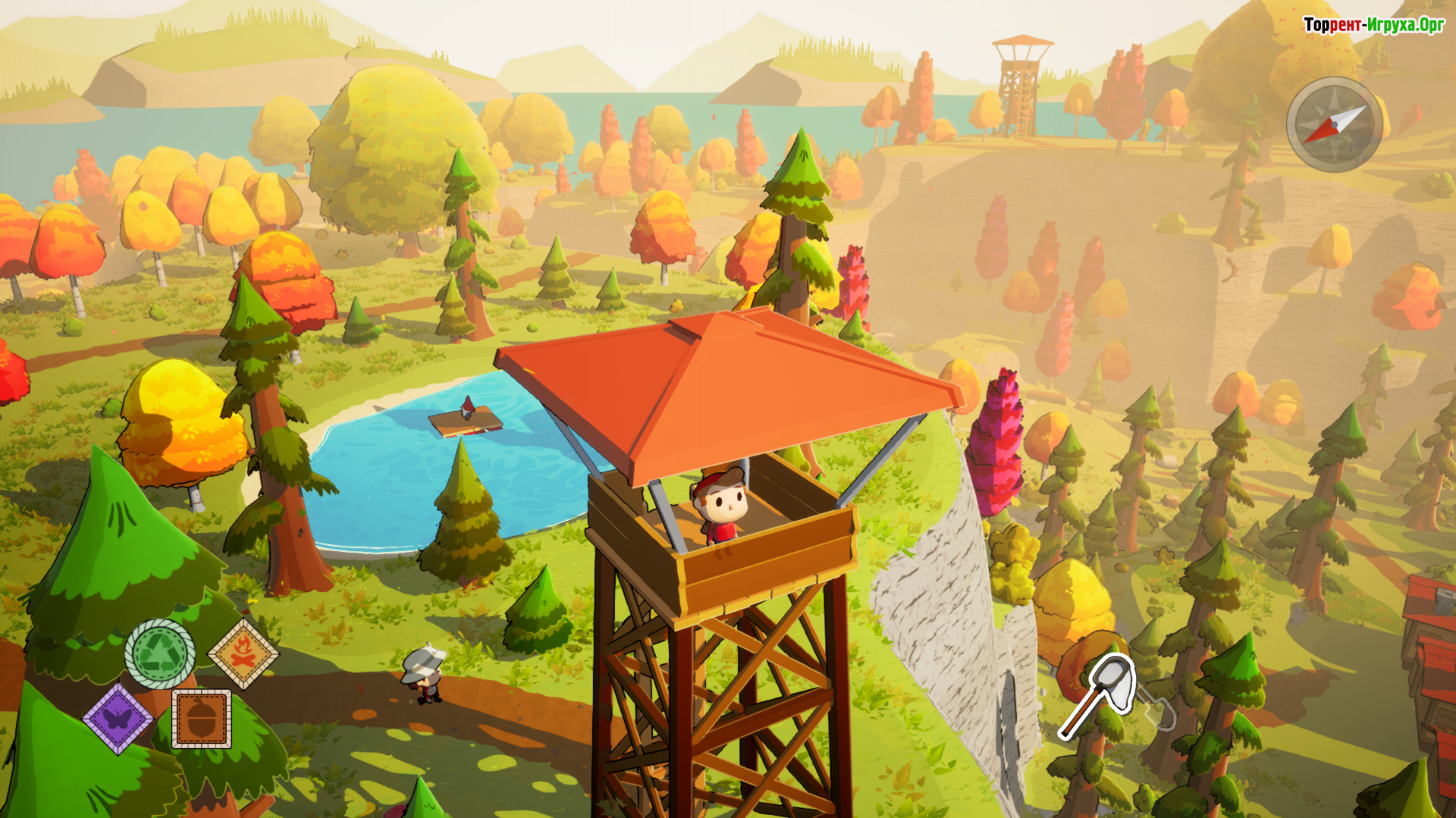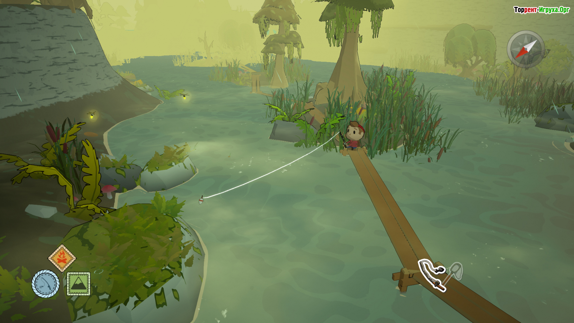 Свободное перемещение по территории лагеря становится ключевой частью игрового процесса. Карабканье по уступам, плавное скатывание вниз по склонам и неспешные прогулки через открытые участки дают ощущение натуральности и легкости. Здесь множество активностей — от рыбалки у озера до поиска мелких существ в траве, все это создаёт насыщенную и атмосферную игровую среду.