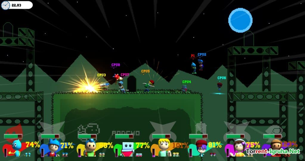 Indie Game Battle привлечет внимание всех любителей инди-игр, ведь здесь в центре событий — персонажи из разных инди-проектов. Эта игра представляет собой многопользовательский файтинг, где одновременно могут сражаться до восьми игроков, что делает каждую битву динамичной и захватывающей.